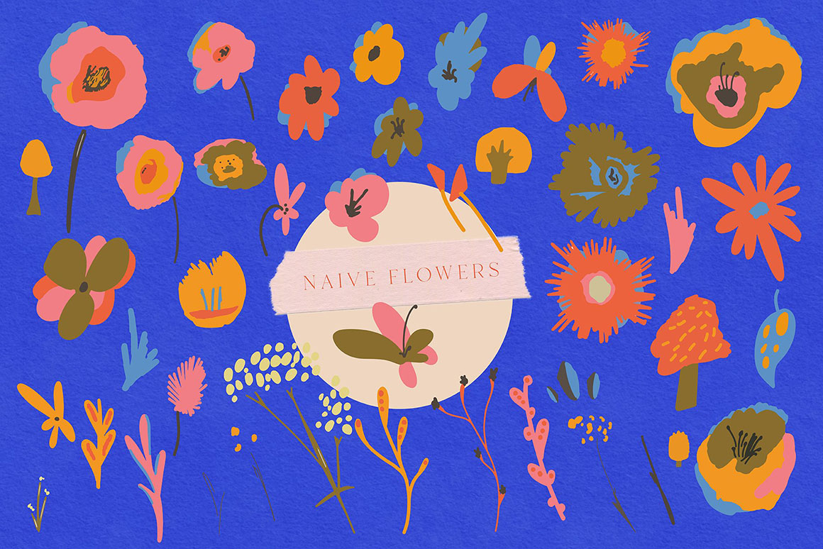 Bright, contrasting and naive collection for your project. This set consists of hand-drawn flowers and abstract elements that you can easily add to your design. This set included different flowers, patterns and abstract elements that can be used individually or combined with other elements. Use ready-to-use patterns and elements, or create your own individual composition using all these bright elements. This is a great addition to create branding for your business, greeting card, photo frames and other beautiful things. Choose one of the element and patterns and create a beautiful logo. Create a branding for your wedding yourself or a design for your pillow that will perfectly fit into your interior.