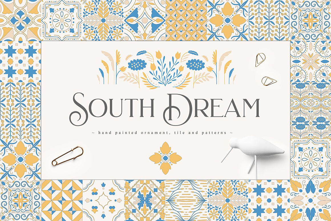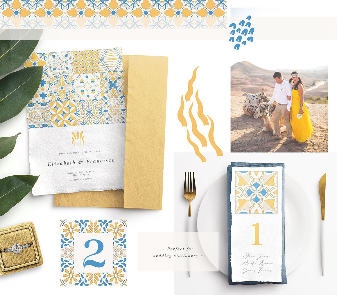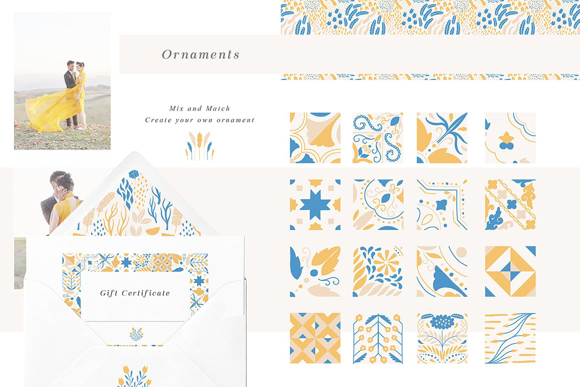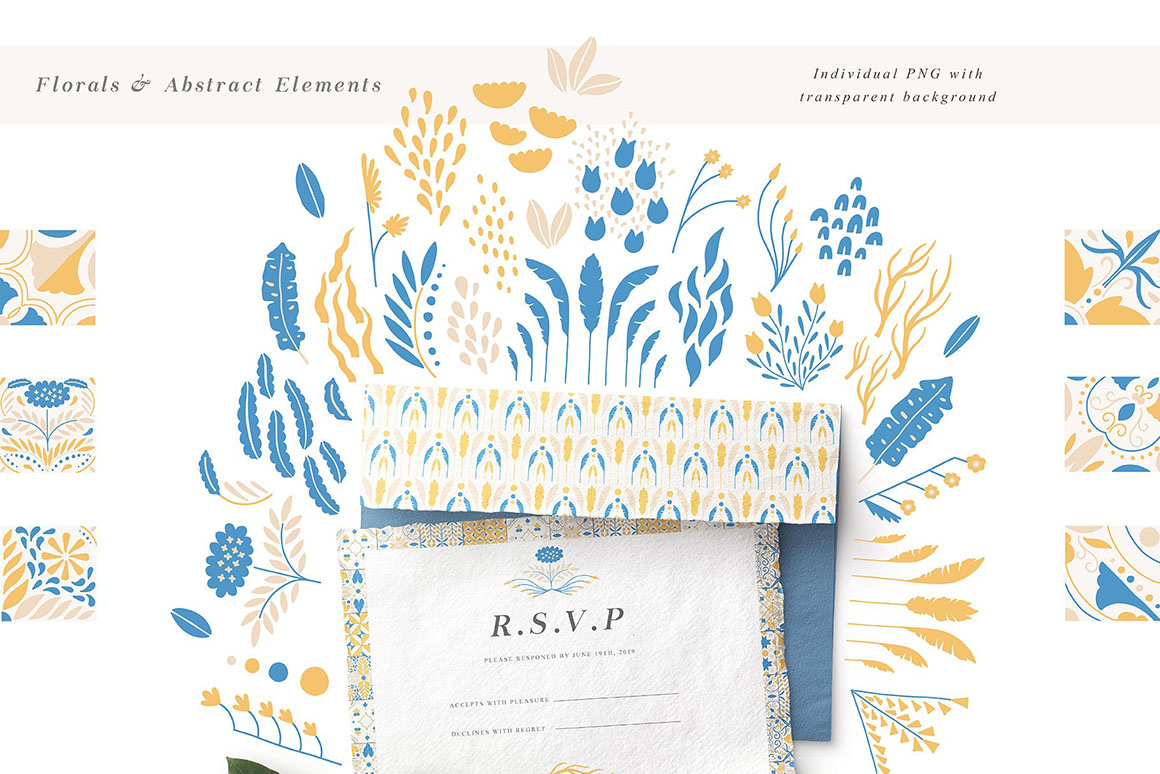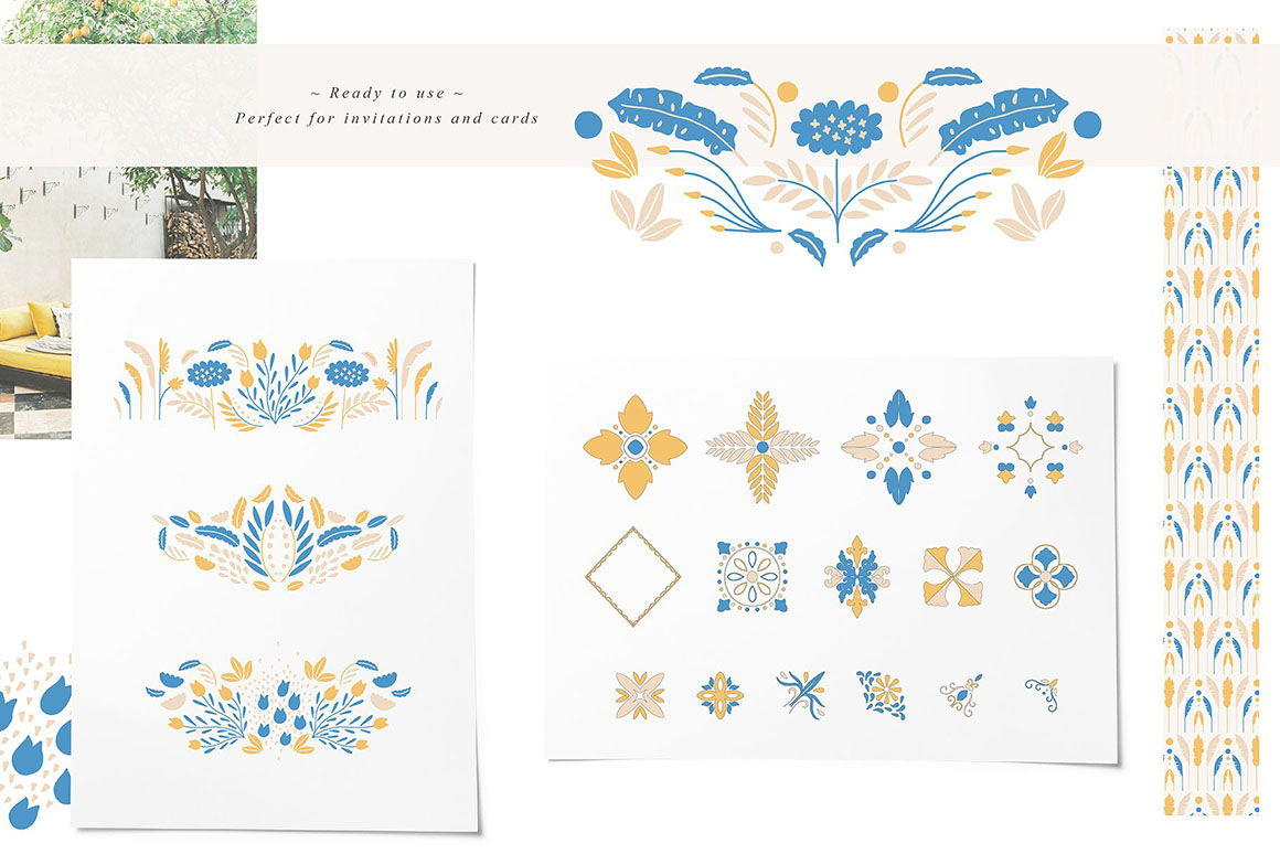 Bright and contrasting southern motifs. This is a great addition to your wedding branding, especially if it happens in some hot, southern and sunny country. Just add ready-made graphics: patterns and borders. But also a big variety of individual elements: tile, ornament and decorative elements. These elements are ideal for the creation of the corporate identity of your shop or your small store. Or if you suddenly need to decorate your room or create a wedding invitation. Add this beautiful hand painted elements and florals to create a postcard.