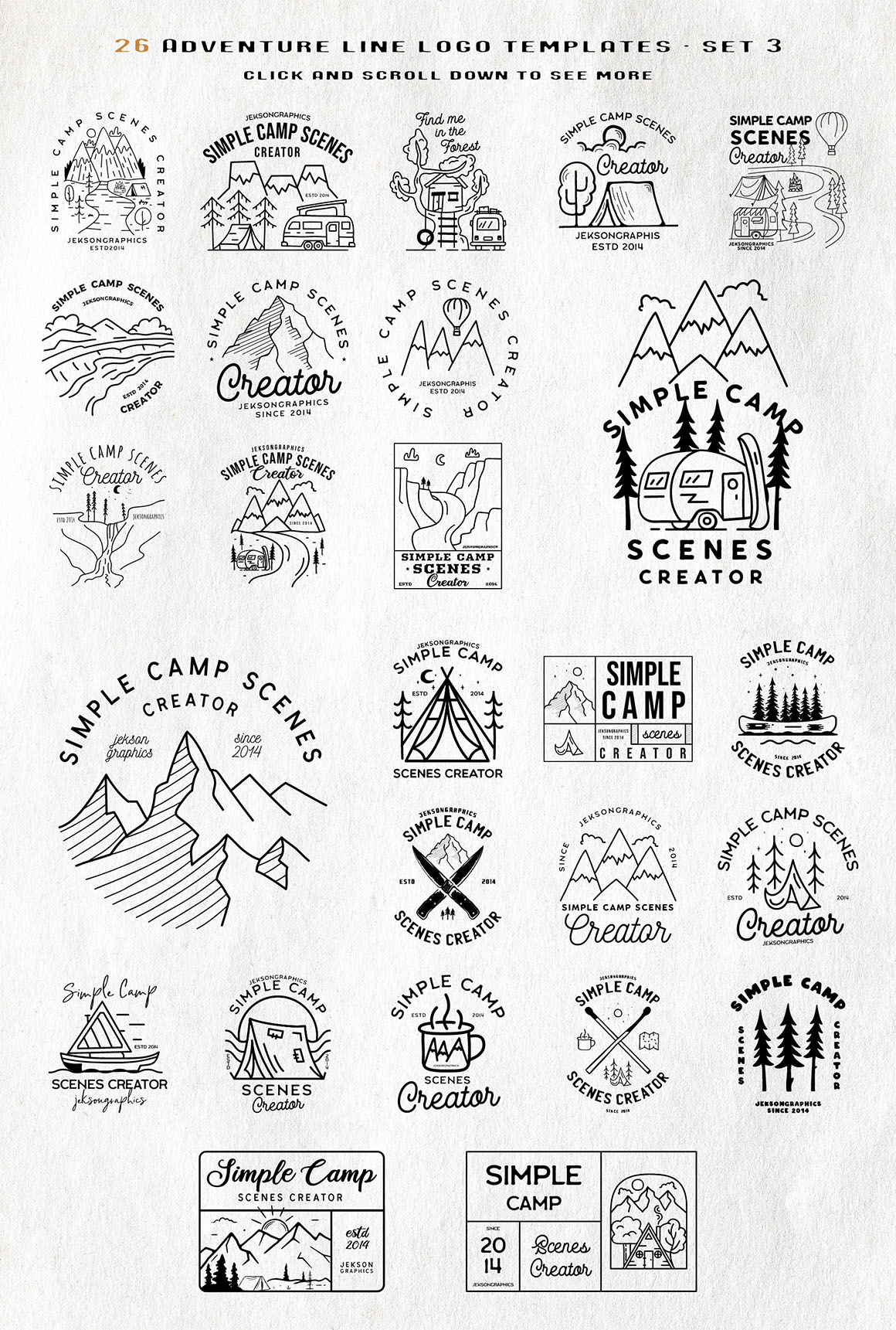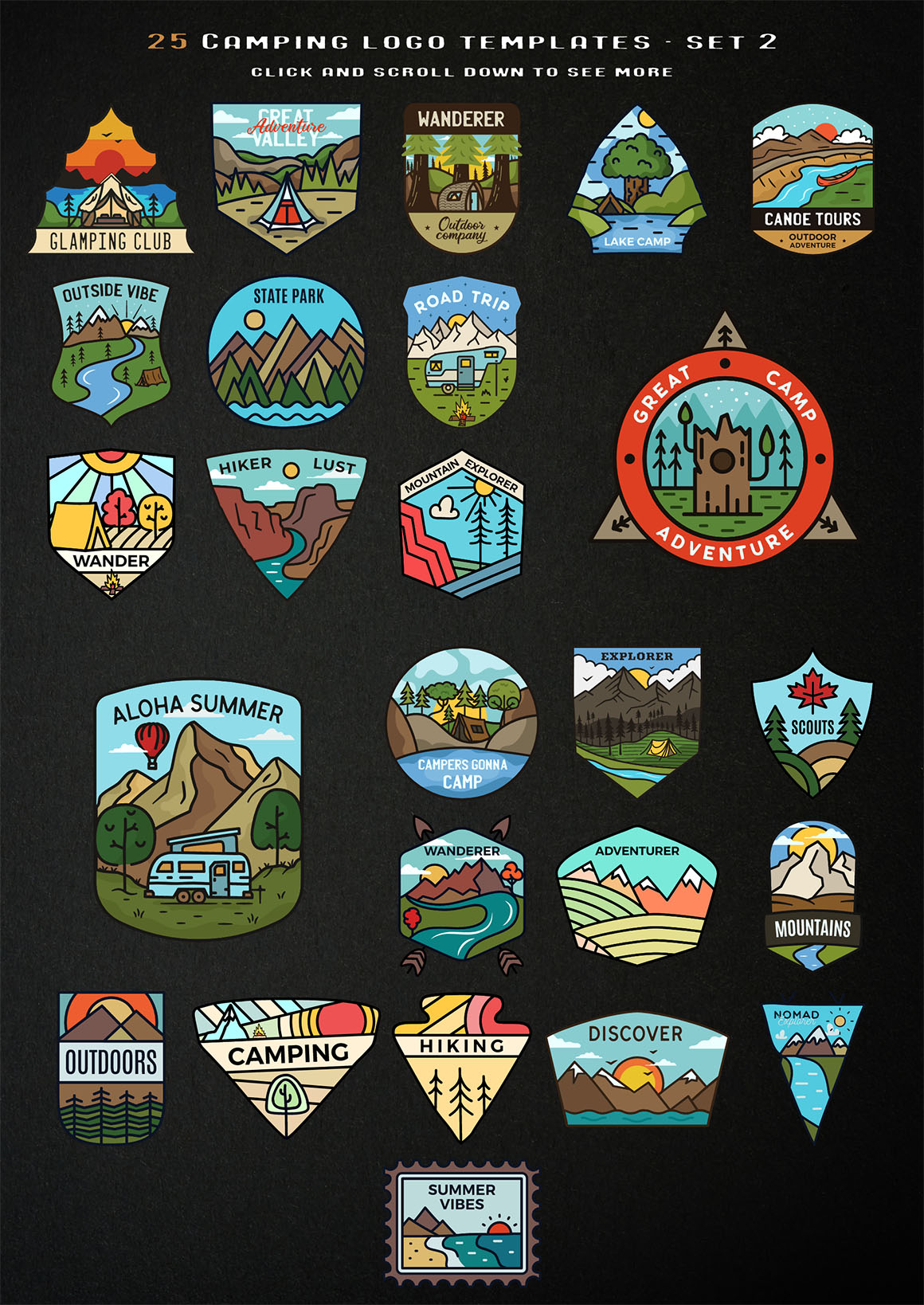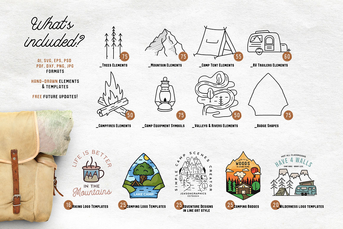 Simple Camp Scenes Creation Kit from JeksonGraphics contains 127 premade & editable vector & Photoshop templates + 590 graphic elements! Don’t miss this retro style designs bundle 😉