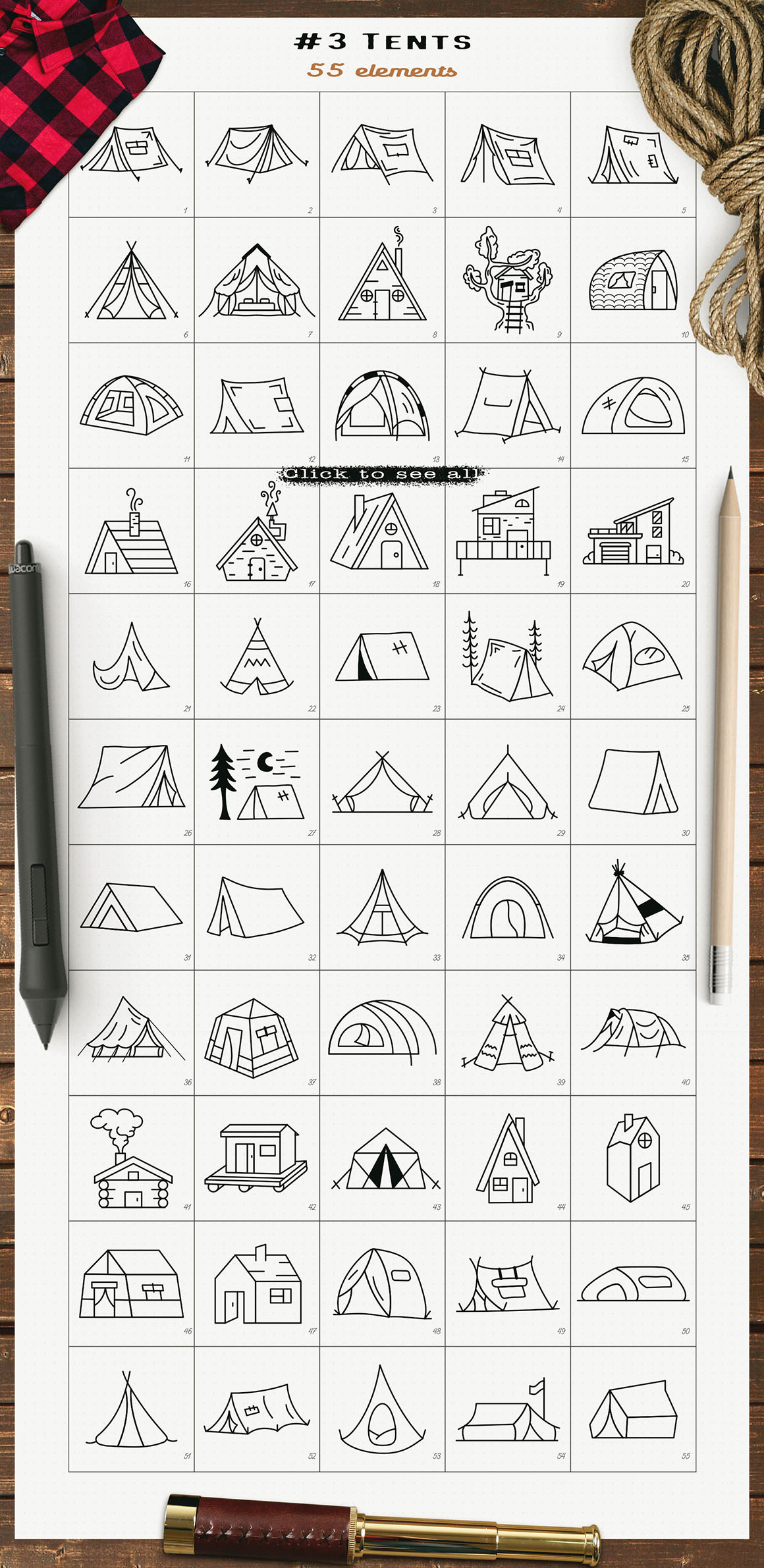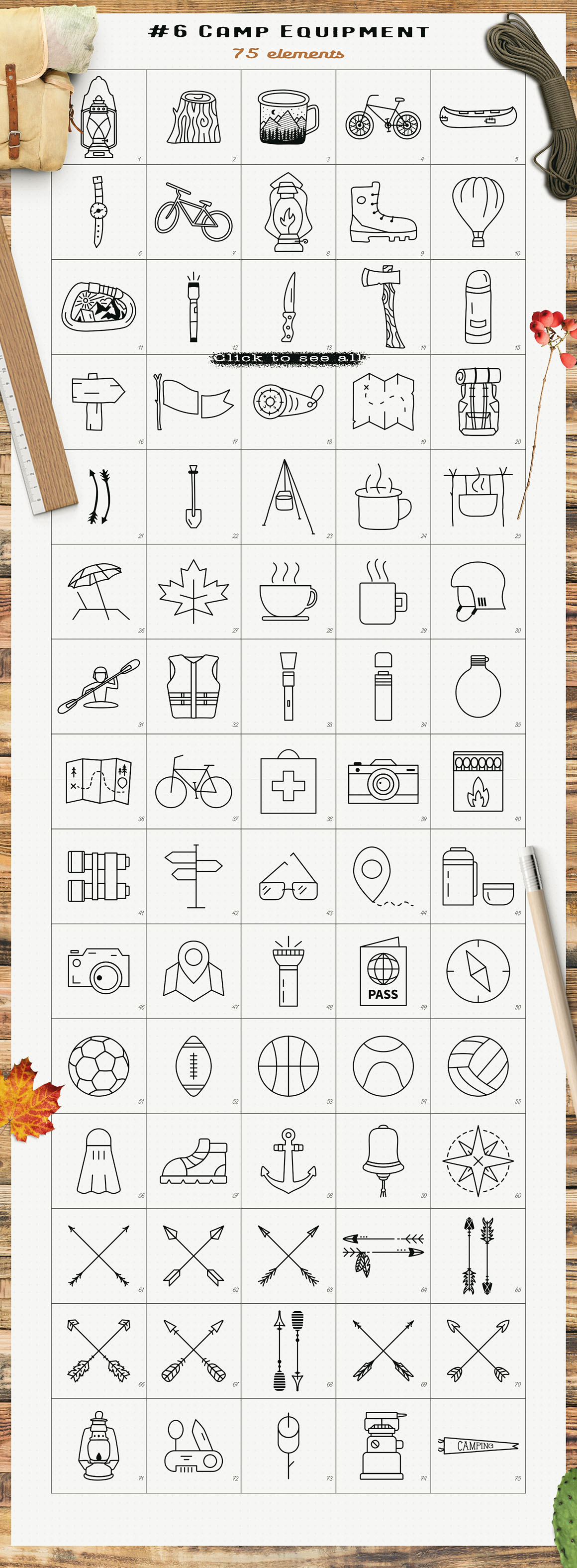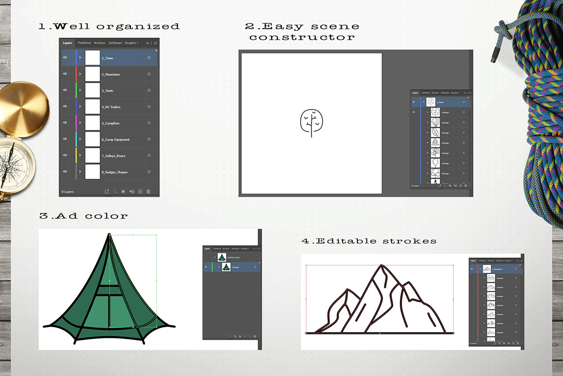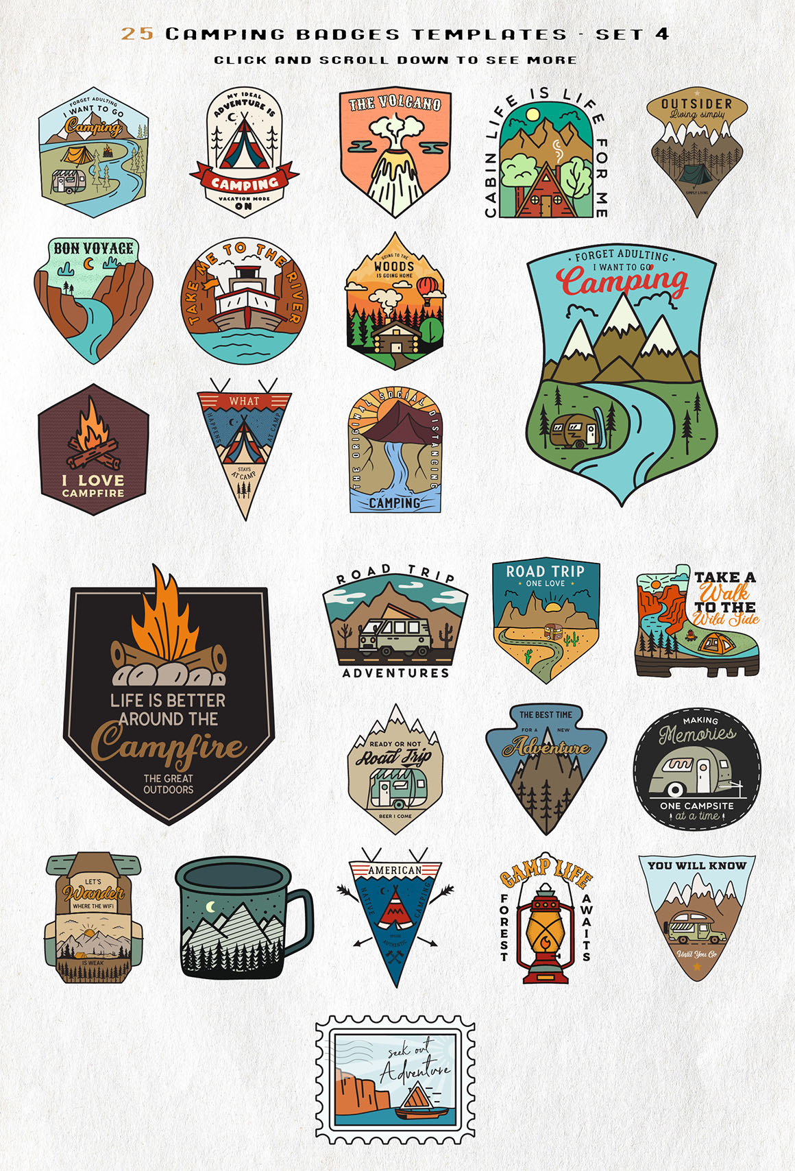 Simple Camp Scenes Creation Kit from JeksonGraphics contains 127 premade & editable vector & Photoshop templates + 590 graphic elements! Don’t miss this retro style designs bundle 😉