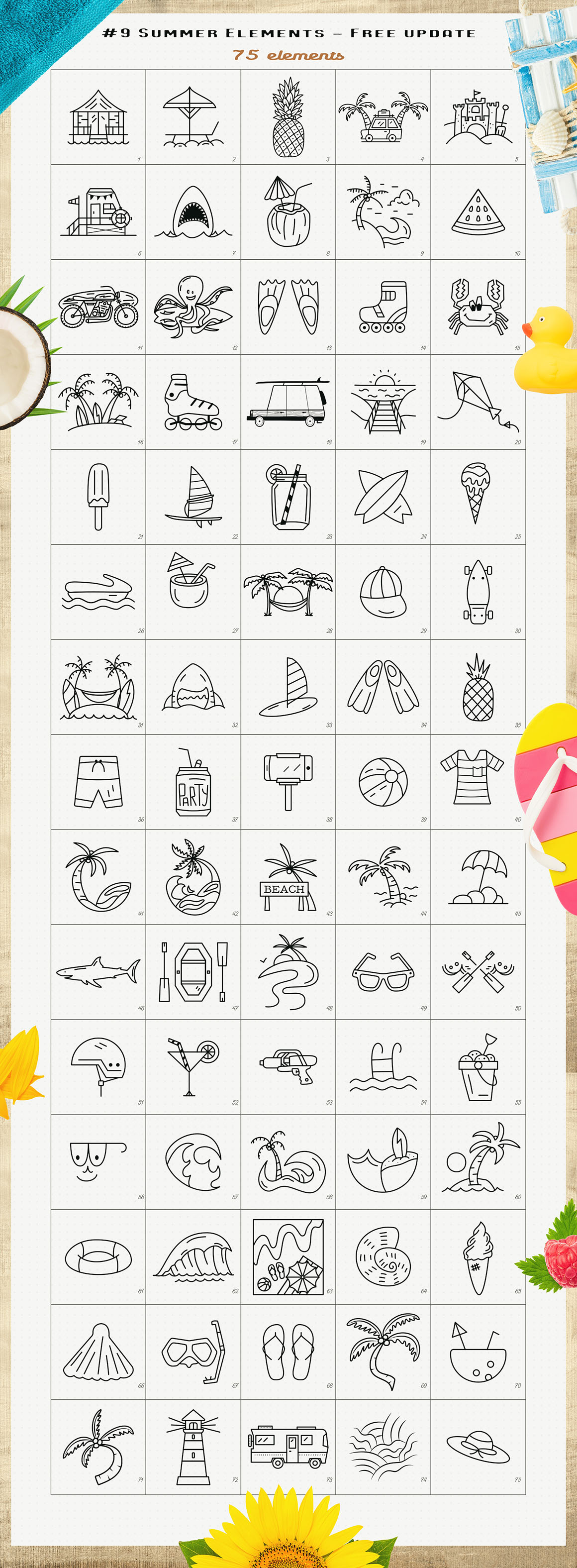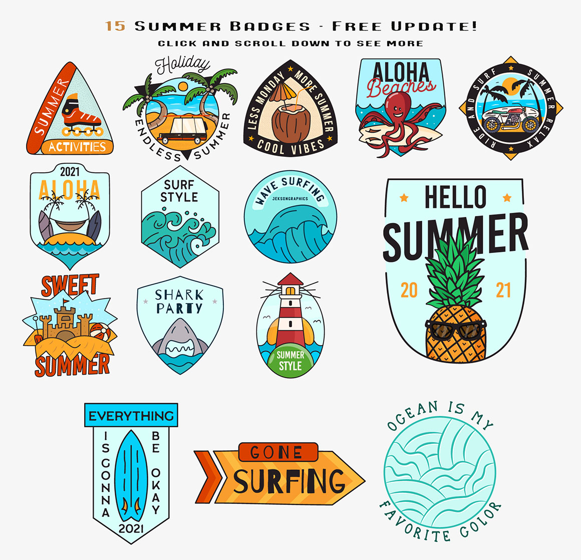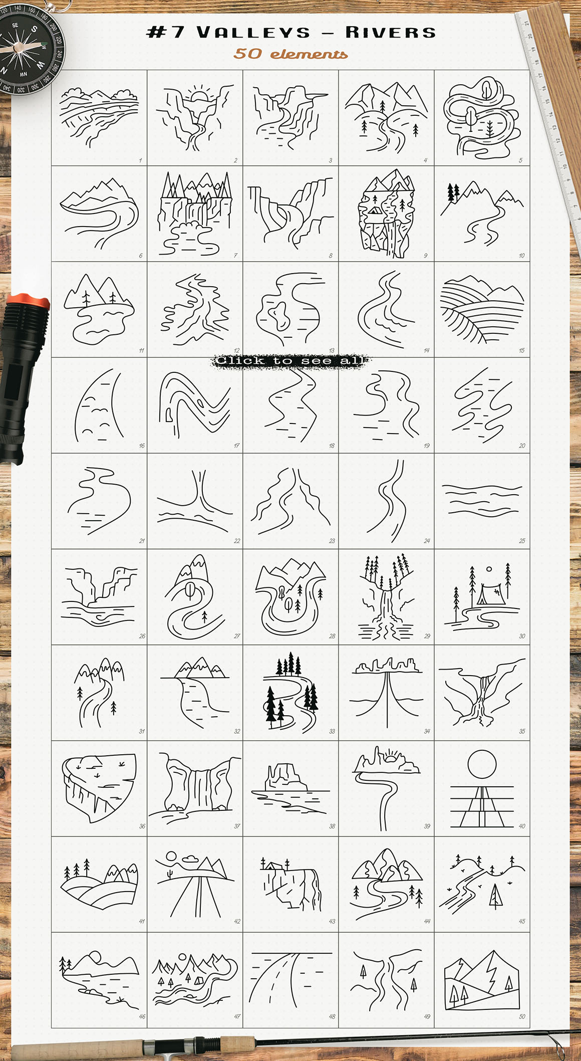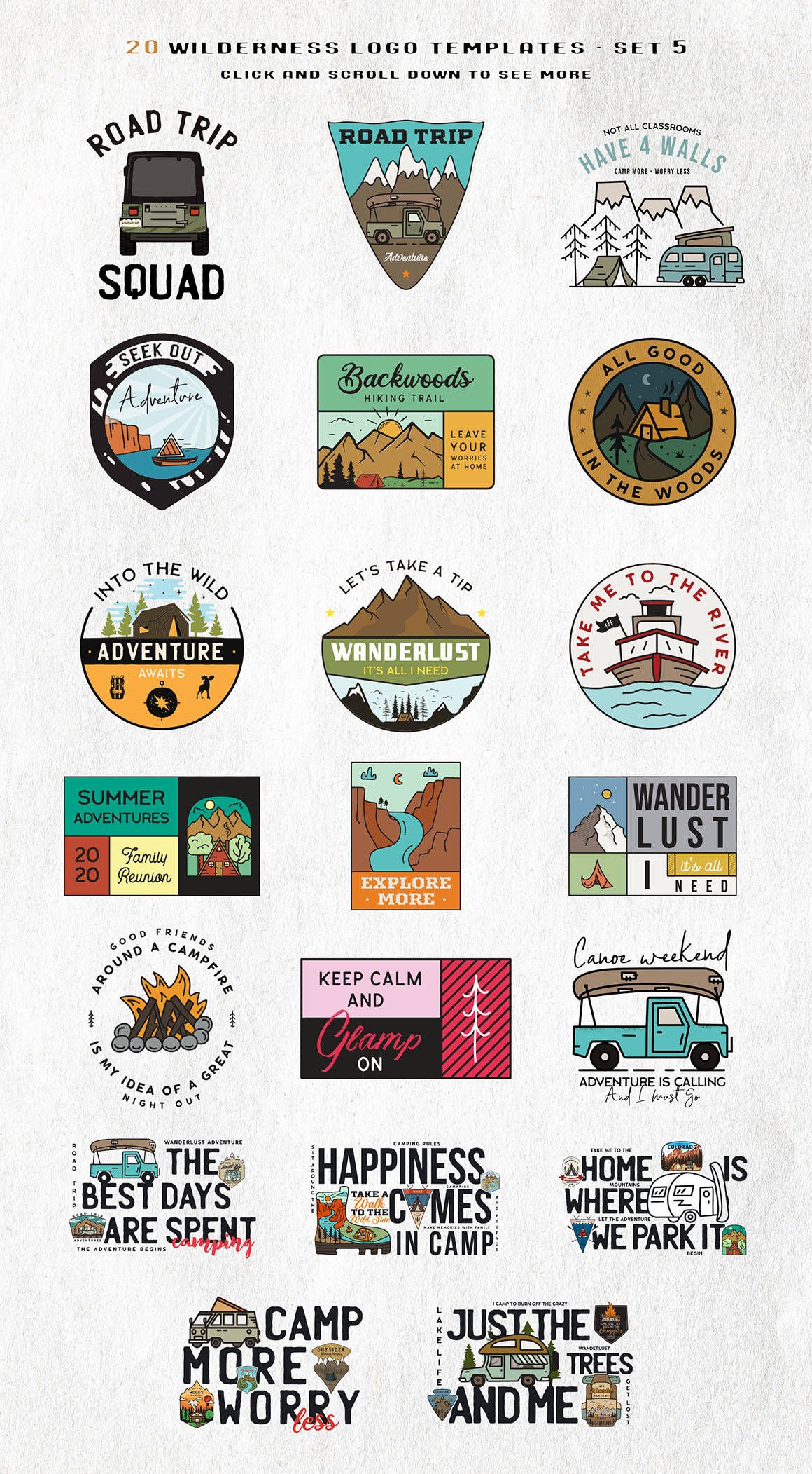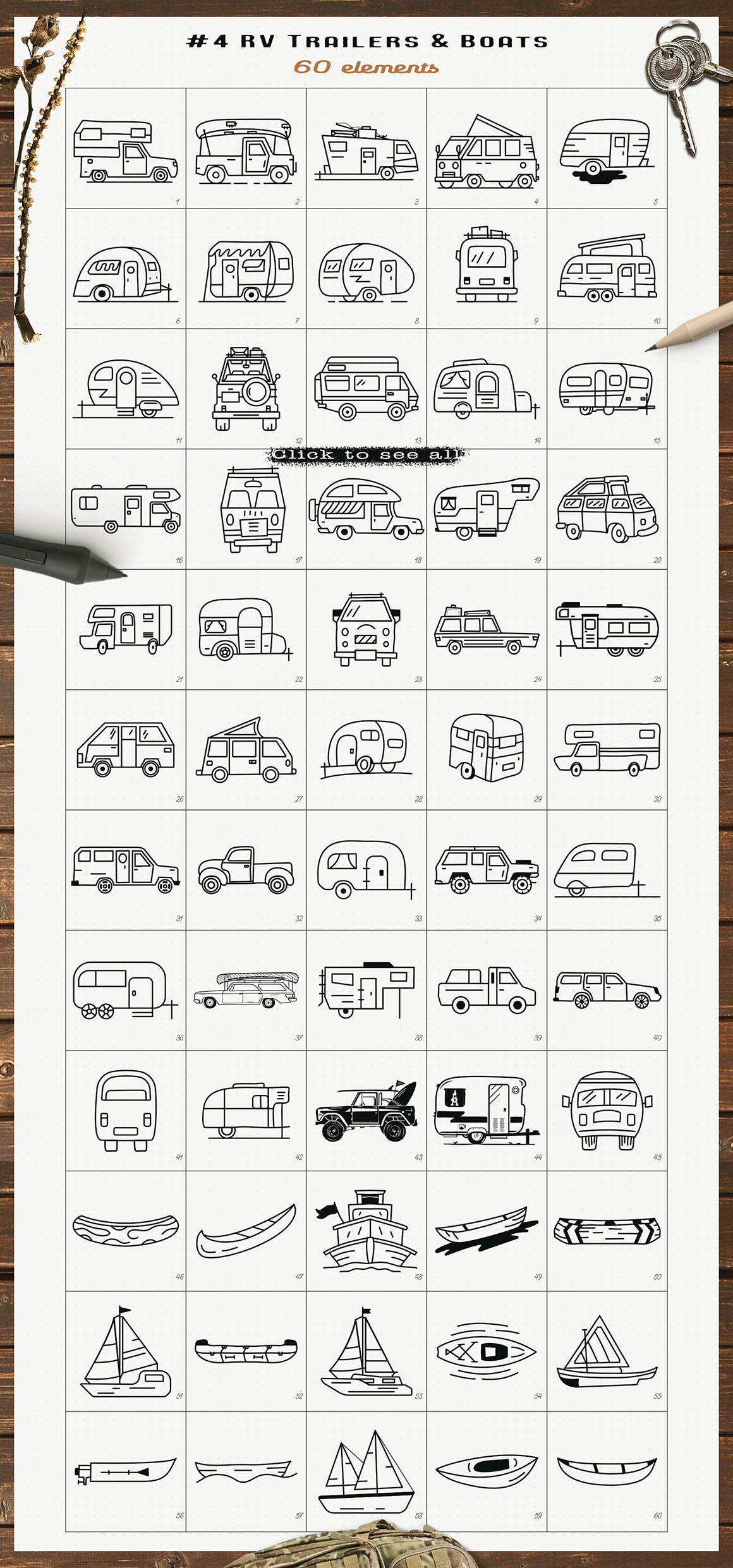 Features 590 graphic elements: trees, mountains, valleys and rivers, tents, RV trailers and boats, summer elements, badge shapes, and much more. Plus 127 premade designs that already included.