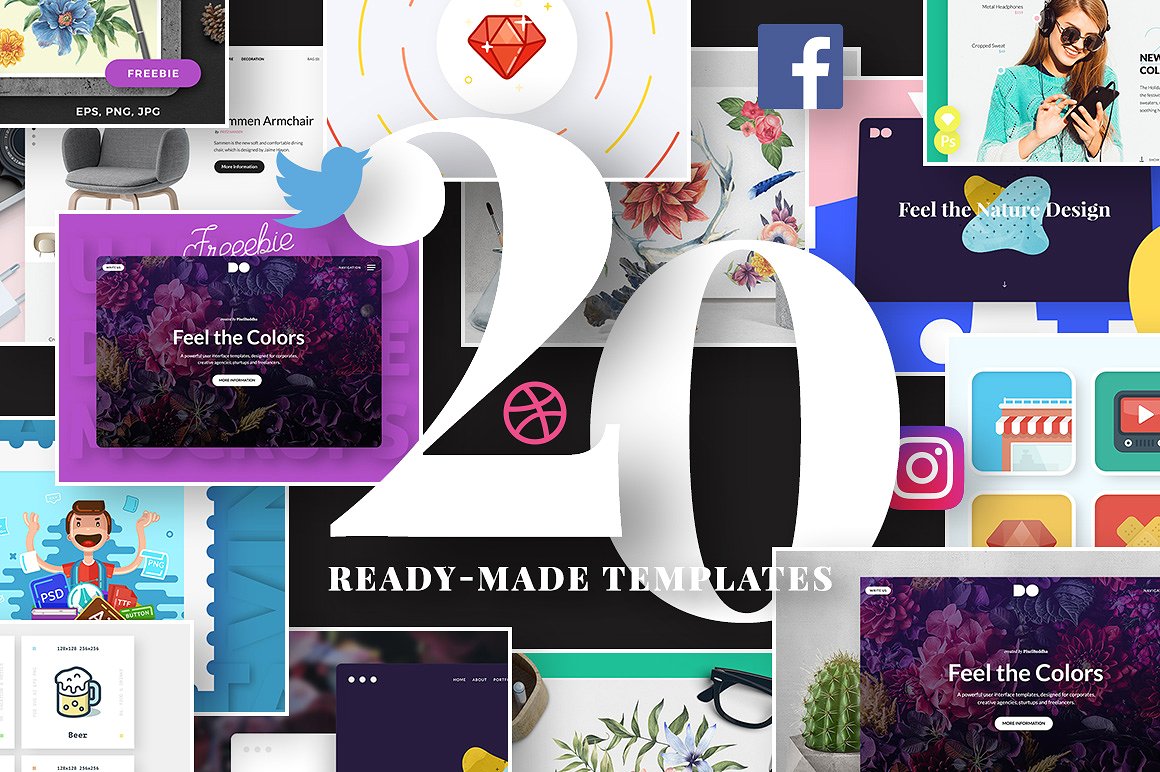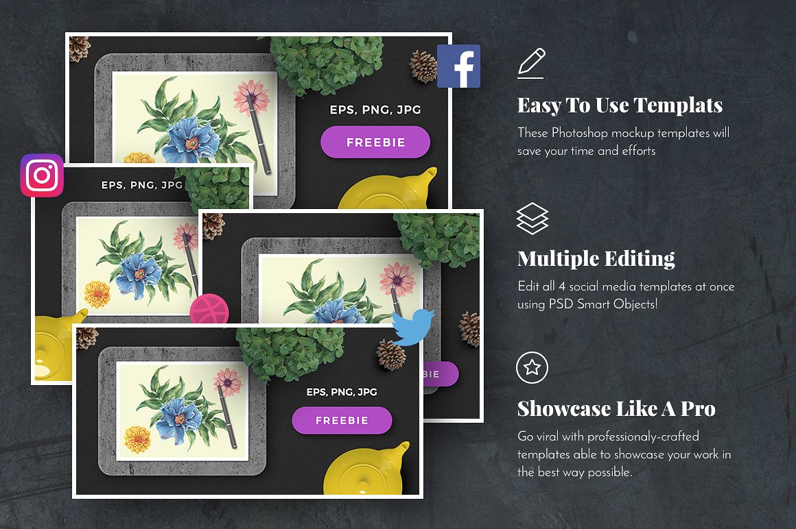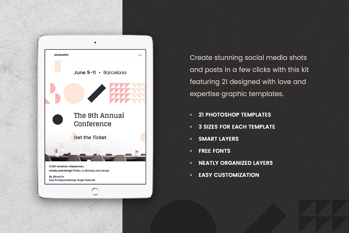 What’s Included: The product comes as 20 templates designed in native dimensions for Instagram, Facebook, Twitter and Dribbble, ready for easy editing via Smart Objects.