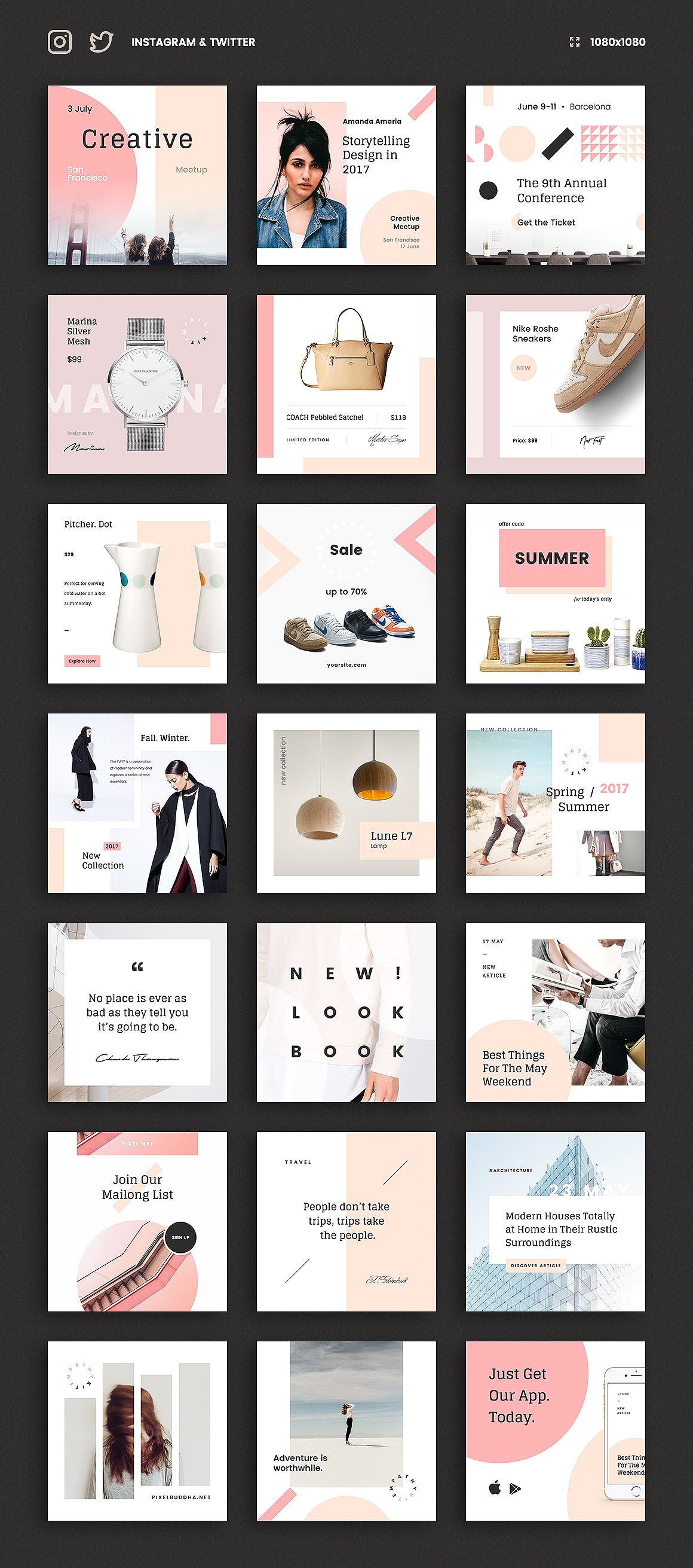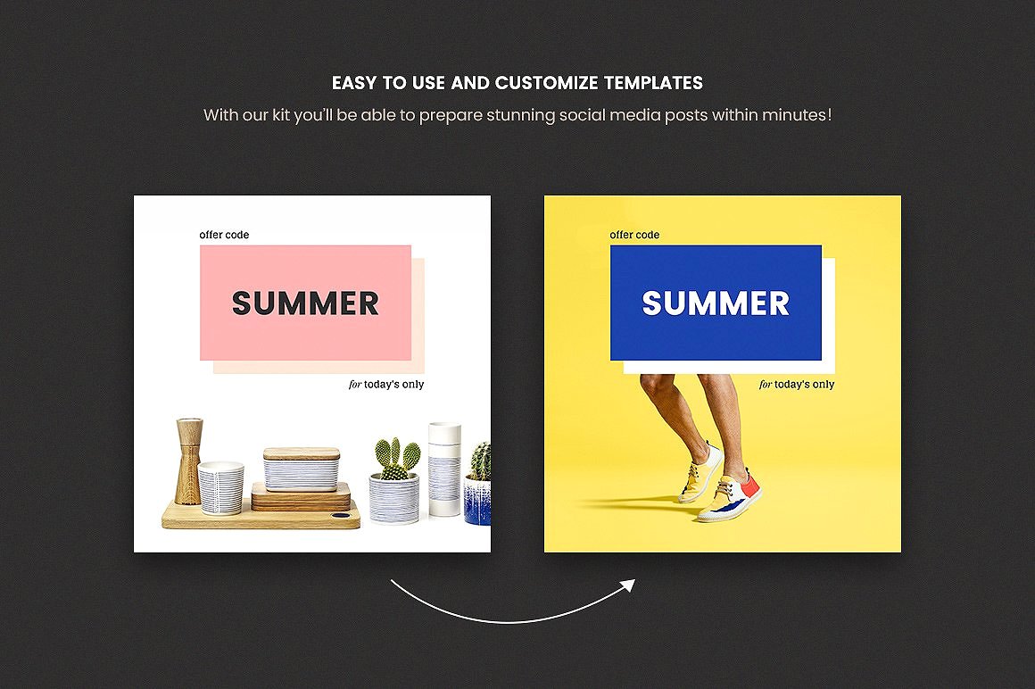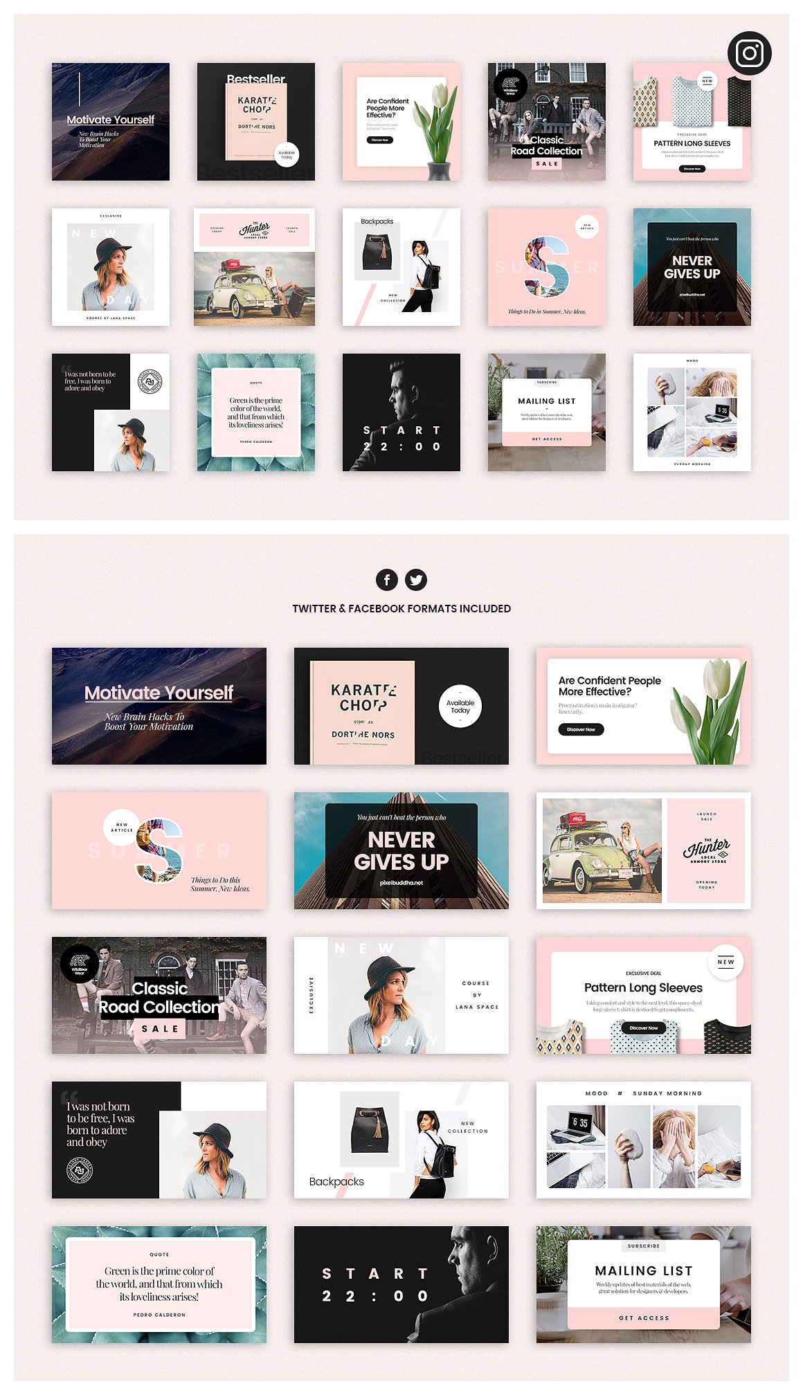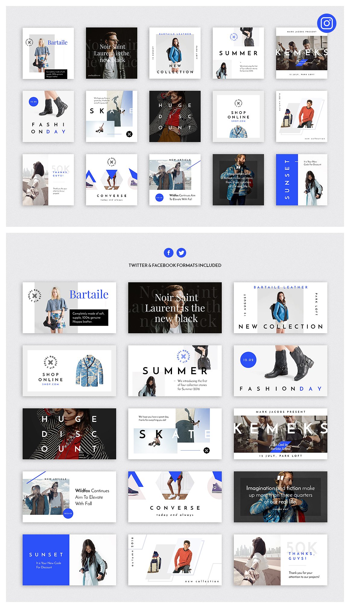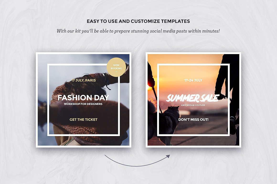 The package includes 15 templates designed natively for Instagram, Twitter, and Facebook. Each of them is easy to edit and customize, all you have to do is replace images with your artwork via Smart Objects and add your copy. That’s it! This set would be a great match for your personal or commercial needs: perfect for bloggers, fashion and retail brands, magazines and so much more!