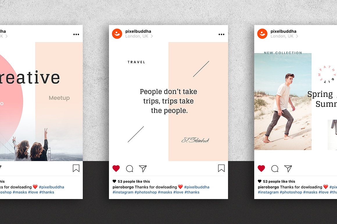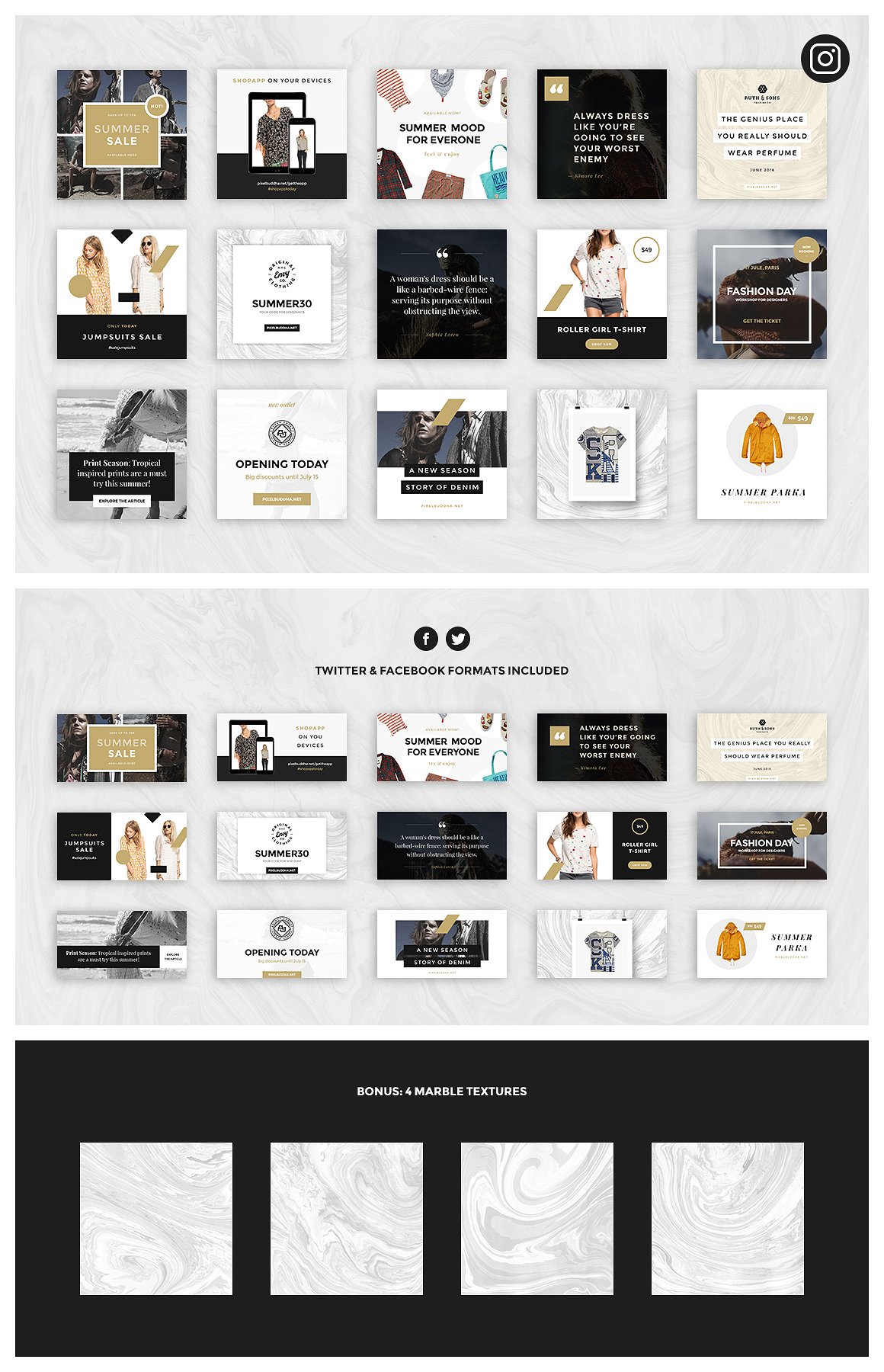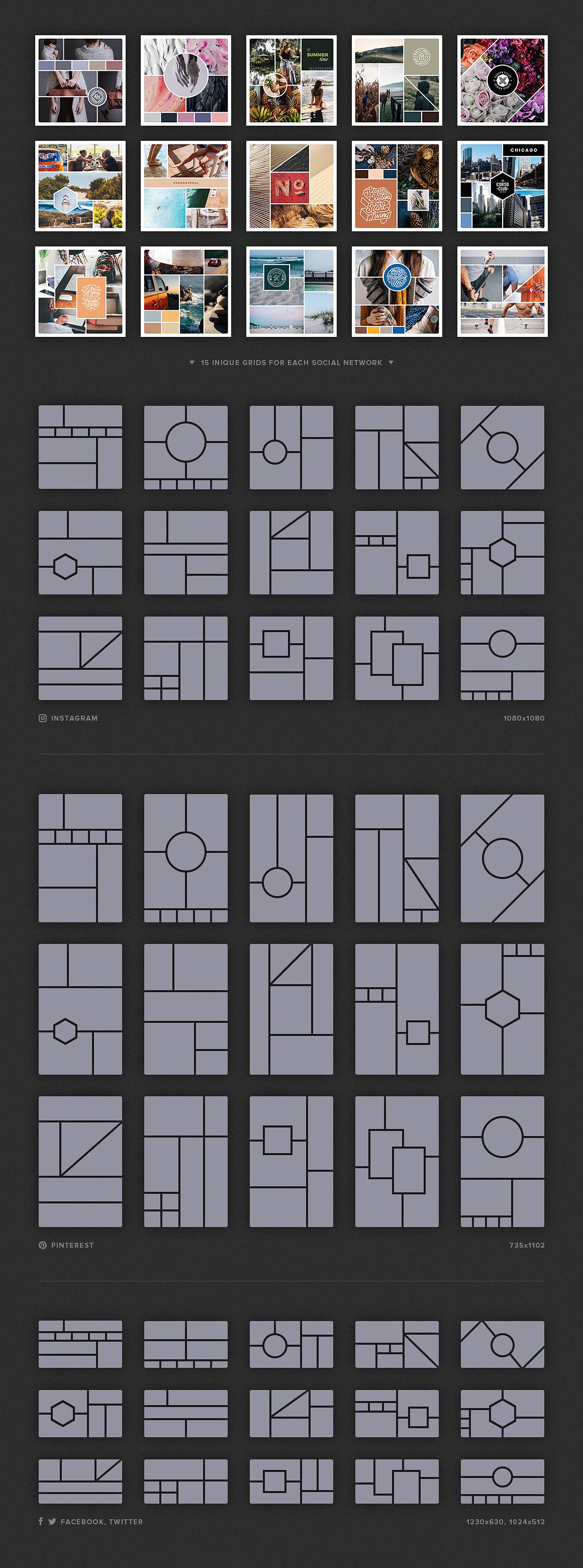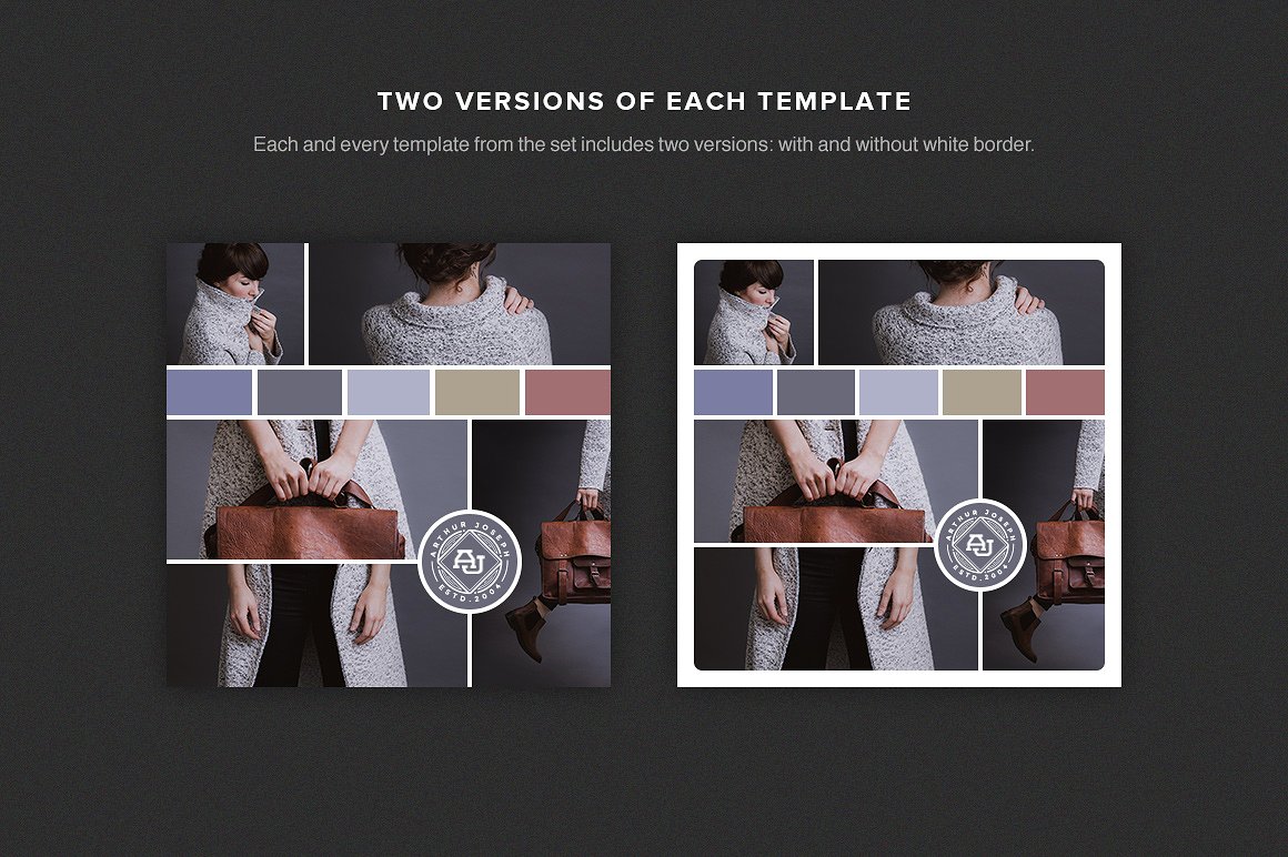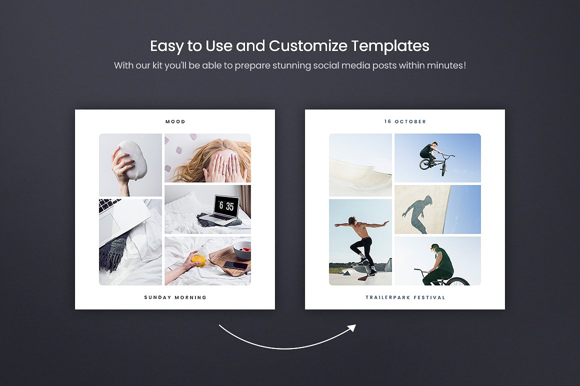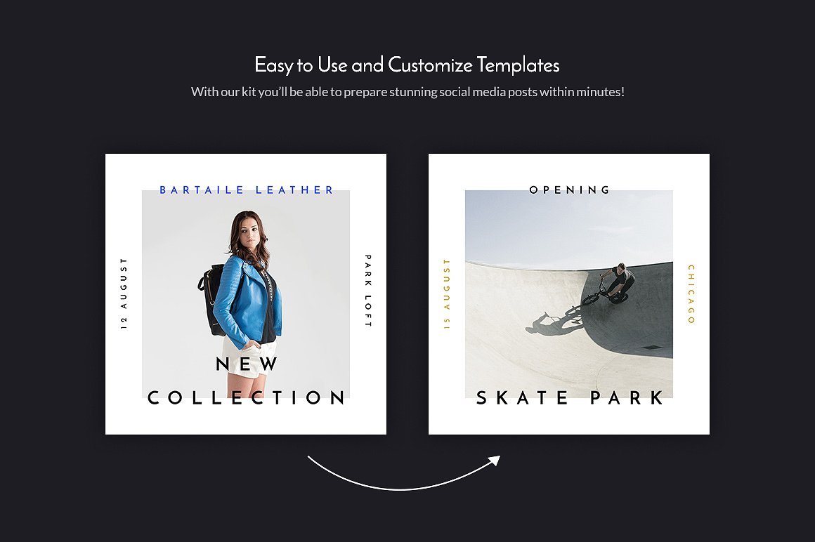 The package includes 15 templates designed natively for Instagram, Twitter, and Facebook. Each of them is easy to edit and customize, all you have to do is replace images with your artwork via Smart Objects and add your copy. That’s it! This set would be a great match for your personal or commercial needs: perfect for bloggers, fashion and retail brands, magazines and so much more!