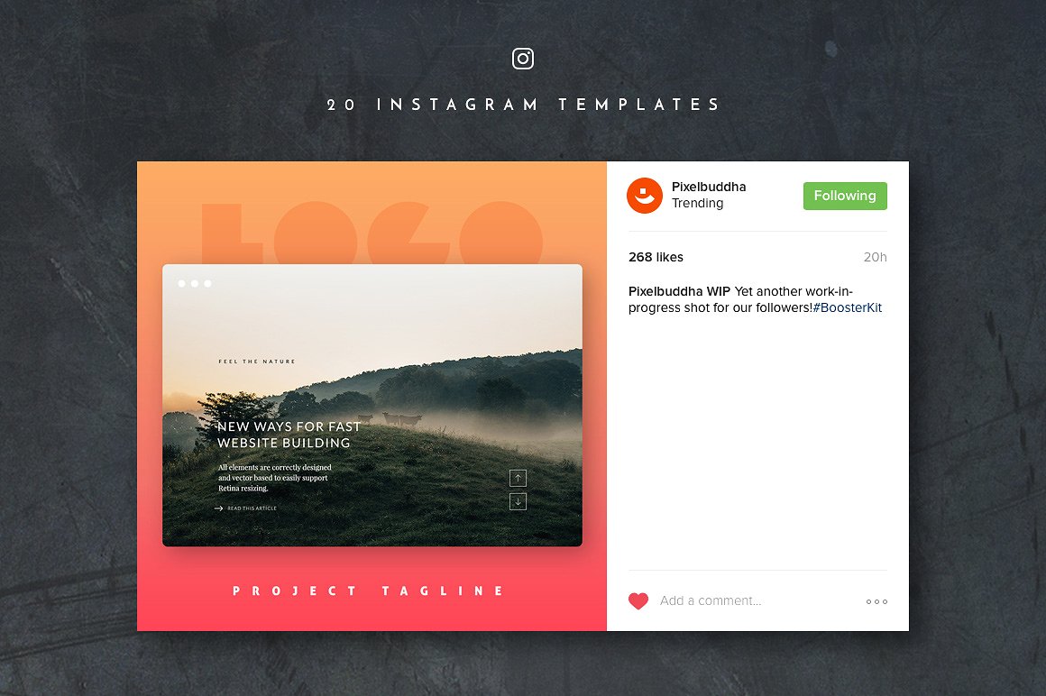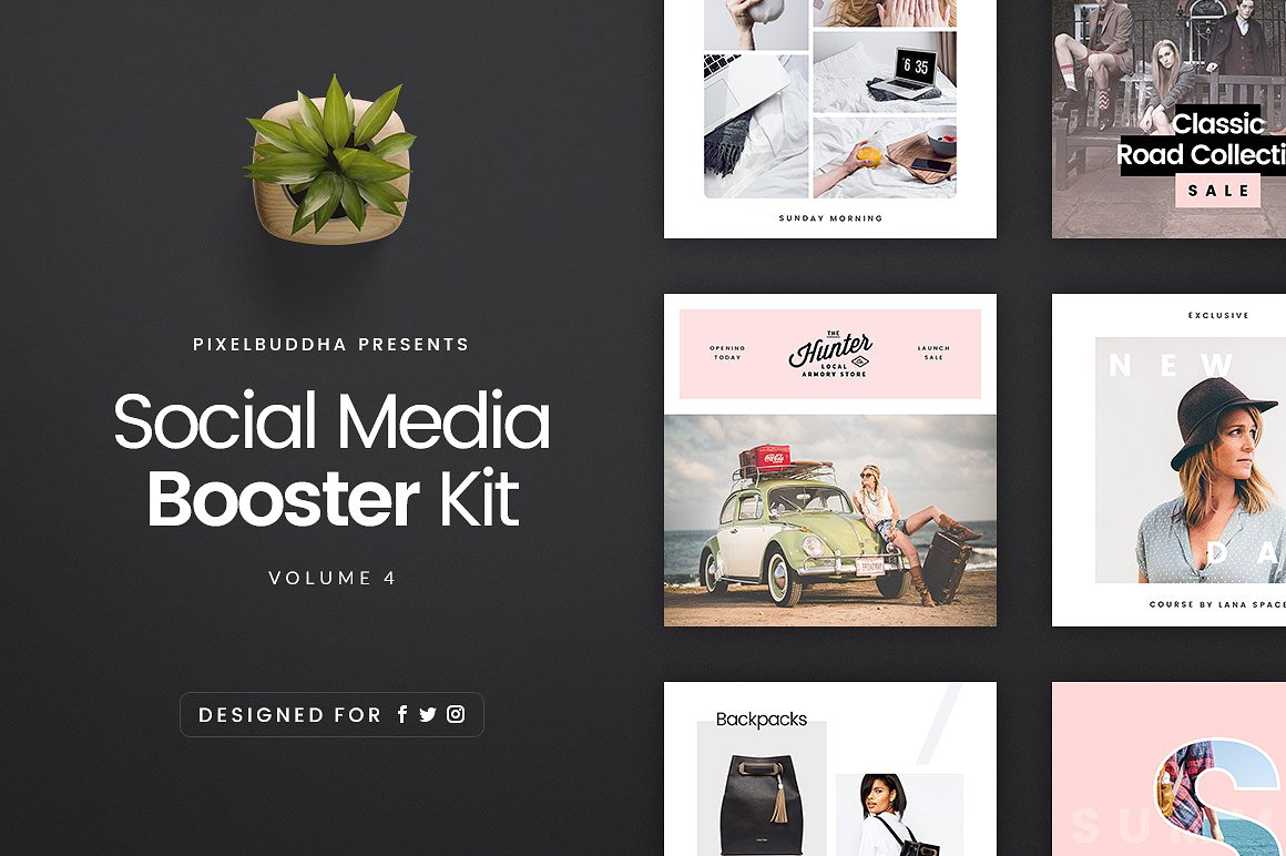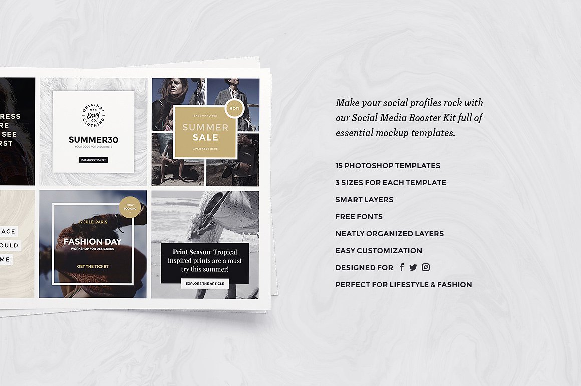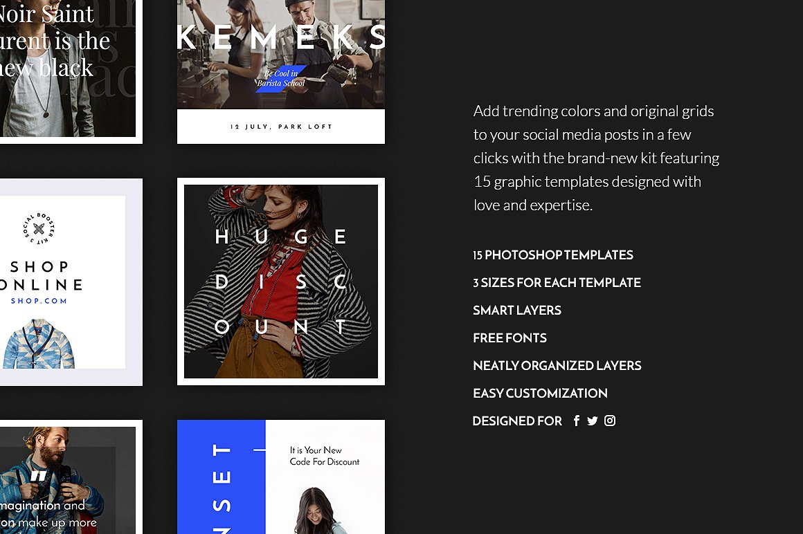Social Media Booster Kit is an amazing way to make you work with social media not only much easier but also more effective! The product includes 15 templates designed natively for Instagram, Twitter, and Facebook. Each of them is easy to edit and customize, all you have to do is replace images with your artwork via Smart Objects and add your copy. That’s it! This set would be a great match for your personal or commercial needs: perfect for bloggers, fashion and retail brands, magazines and so much more!