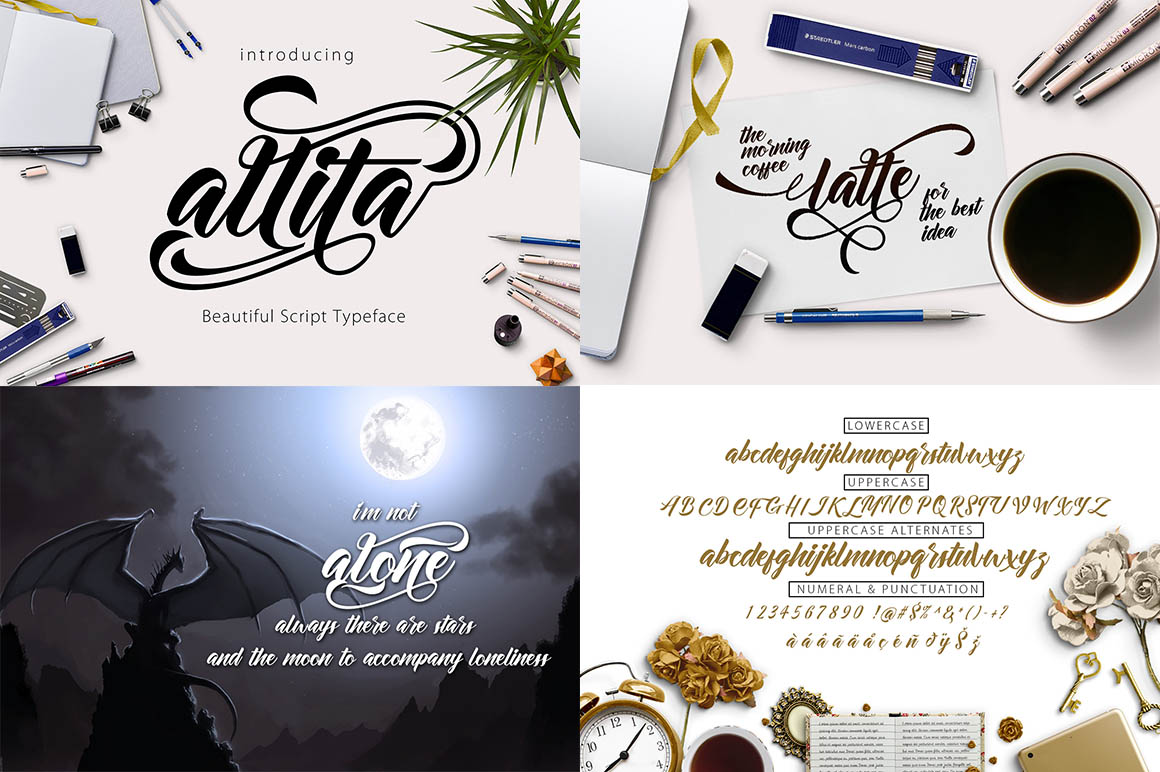 Allita Script is a Beautiful Calligraphy typeface, It suitable for wedding invitation, greeting cards, T-Shirt, Logo or any design that you create. Allita Script comes with a complete set of standard characters, Punctuation, international glyphs, The alternative characters were divided into several OpenType features such as Ligature, Alternates and has given PUA unicode (specially coded fonts).