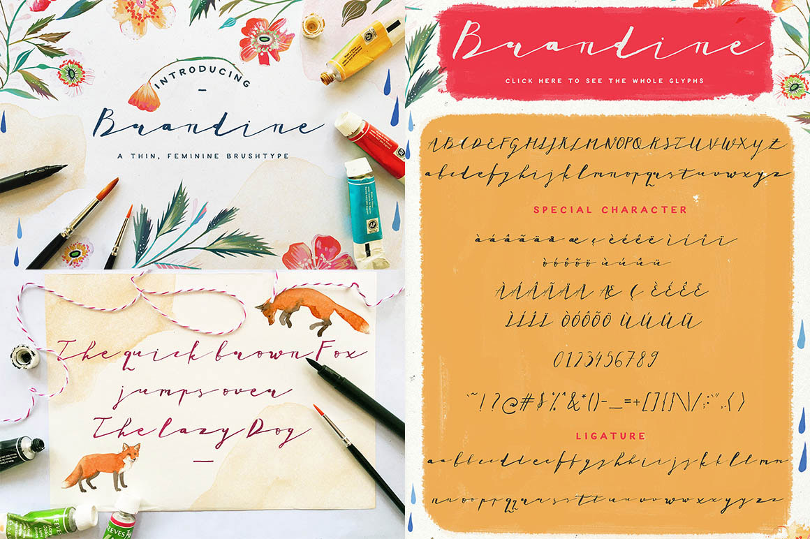 Brandine is a feminine typeface, made of thin brush and watercolor. You can use Brandine best for your wedding cards and invites, greeting cards, title for your illustration, logo, return address, and other types of branding work. Brandine comes with accented glyphs and ligature feature.