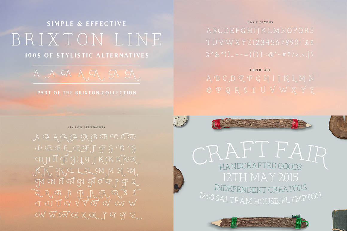 Brixton Line is a simple and effective handcrafted serif font but within a few clicks, you can transform Brixton Line into something unique and creative. With over 80 stylistic alternatives to choose from this font is great fun to work with! The font is an all-capitals font, the uppercase letters are slightly stylized versions of their lowercase counterparts and the remaining 87 alternatives are available through the glyph palette.