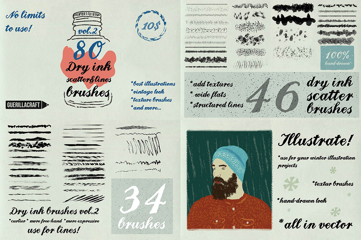 80 absolutely great dry ink brushes – 46 scatter brushes + 34 line brushes!!! pack contains two files: you can choose of 1 file for Adobe Illustrator CS6 and higher or file with AI CS5 and lower (to CS2 – this file have CSV in end of name!) There is a lot of ways how to use this brushes, but I am pretty sure it fits for your winter or christmass graphics and illustrations!