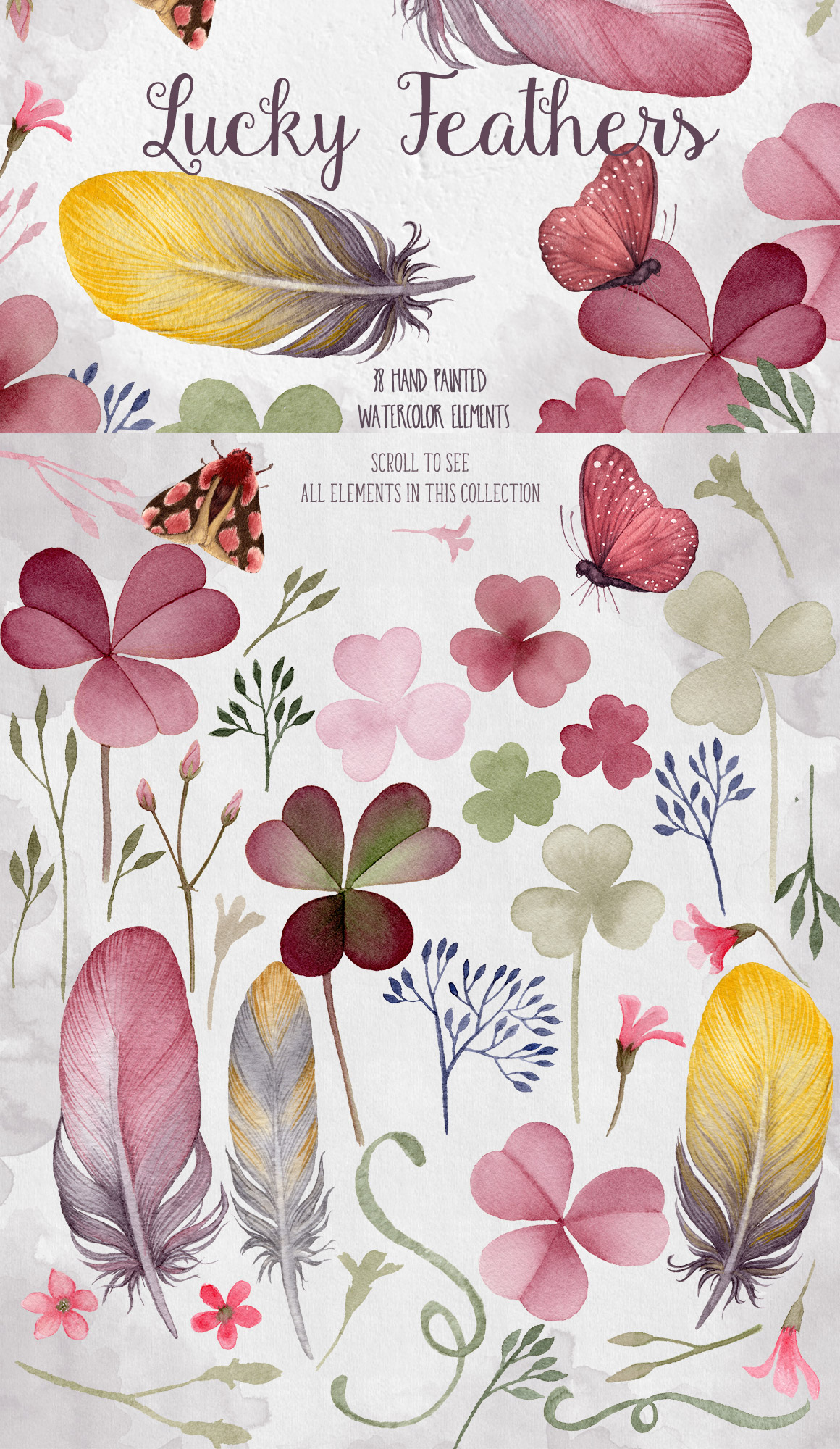 A beautiful gentle collection of watercolor clovers and feathers, a butterfly and a moth, perfect for wedding invitations, party invitations, greeting cards, covers etc. All elements in this collection are high quality transparent background PNGs with 300dpi resolution. The size of elements starts at 1070 px and the largest is 5075px.
