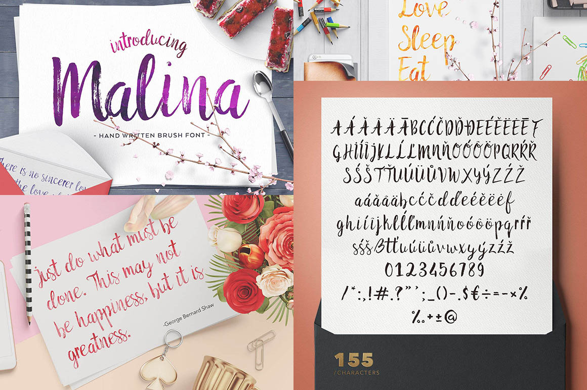 Malina Brush Font is a hand brushed font with multilingual support. Malina is ideal for restaurant menus, greeting cards, invitations, weddings and many more. It is created with dry ink brush. This font contains 155 characters and main file includes the following formats: .TTF, .OTF.