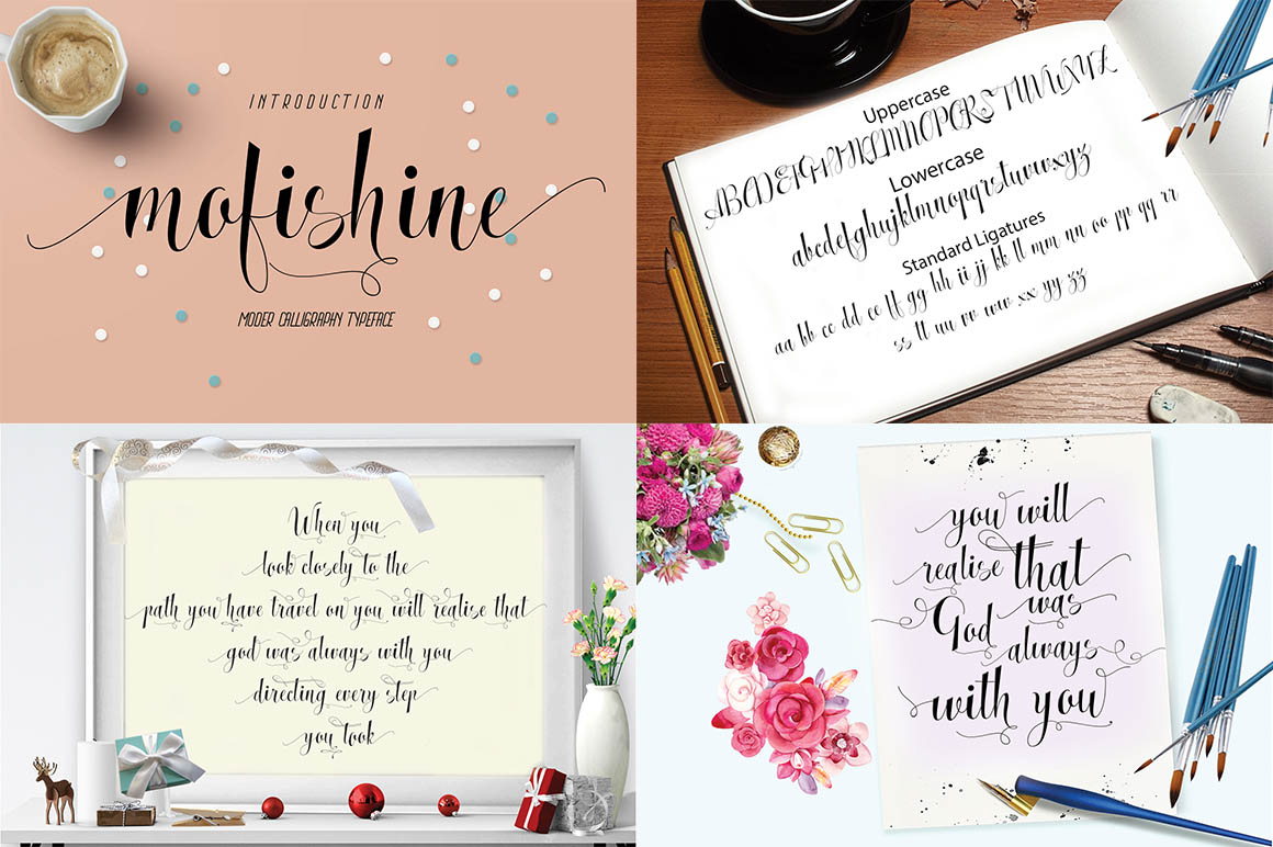 Introducing Mofishine Script – fresh and modern new script with sweet style calligraphy, decorative and basic character dancing, can be used for many purposes. such as title, signature, logo, correspondence, wedding invitations, letterhead, signage, labels, newsletters, posters, badges and more! Mofishine script comes with 615 glyphs and has given PUA Unicode (font specific code). Alternate characters are divided into several OpenType features such as Stylistic Sets, Contextual Substitute, and ligature. OpenType features can be accessed using OpenType savvy programs like Adobe Illustrator and Adobe InDesign. Also supports in pragram, Adobe Illustrator, Adobe Photoshop, Adobe InDesign, Corel Draw X version, Microsoft Word, Language Support : Albanian, Basque, Breton, Chamorro, Danish, Dutch, English, Faroese, Finnish, French, Frisian, Galician, German, Icelandic, Italian, Malagasy, Norwegian, Portuguese, Swedish.
