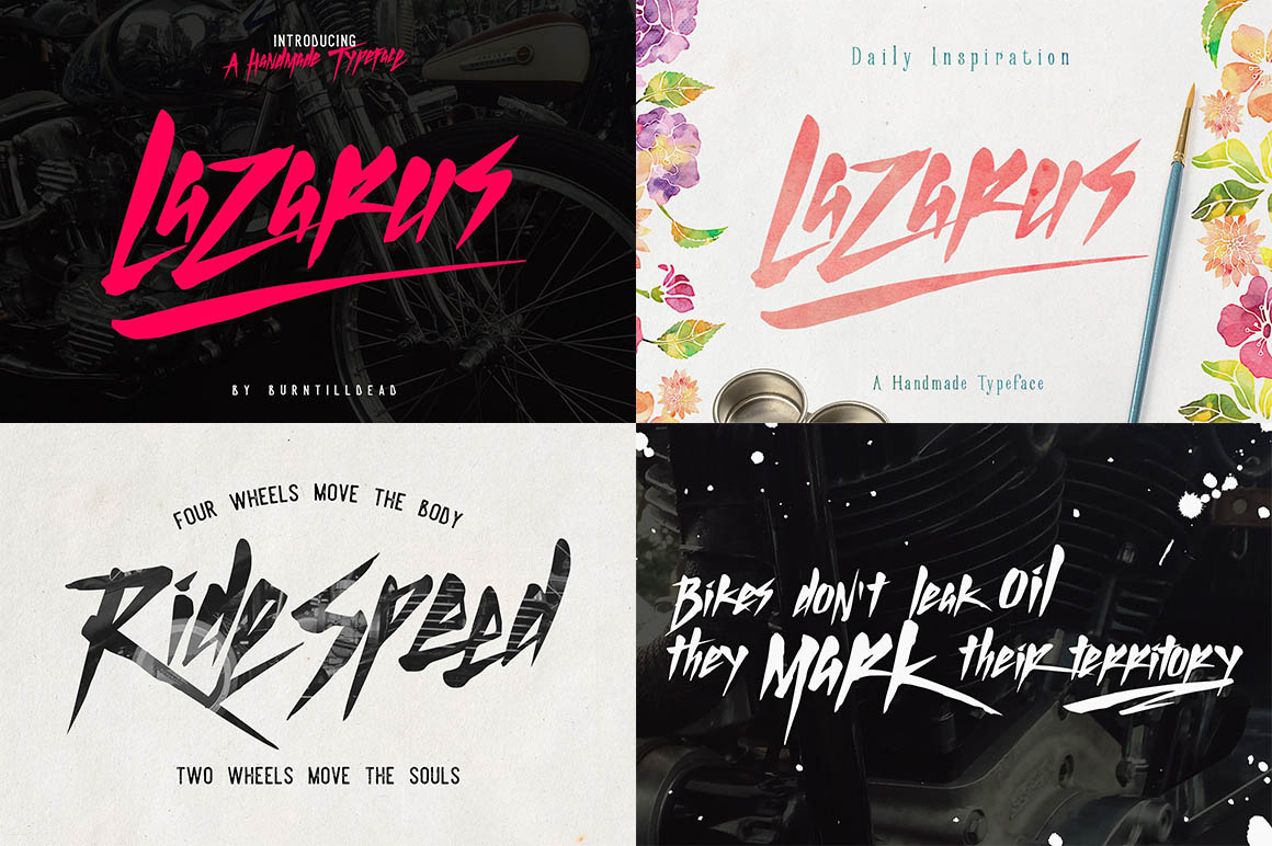Say Hi To Lazarus!!! A Hand drawn type face. signature-style font designed to create personal, stylish lettering quickly & easily. What’s the sory behind? It’s been a few years since my first Illustration been use for music industries, factor, and brands. There’s a couple biggest name on my list, let’s say Falling in Reverse, Alice Cooper, Gratefull Dead, Bad Religion, ect. Sometimes They more prefer to use stylish lettering as Alternate Logo. Start from there, I’ve been developed some Signature Style font that can use easily, so here’s one of them… Alternates Glyphs for several key Upper & lower case characters are also available, accessible in the Adobe Illustrator Glyphs panel, or under Stylistic Alternates in the Adobe Photoshop OpenType menu.