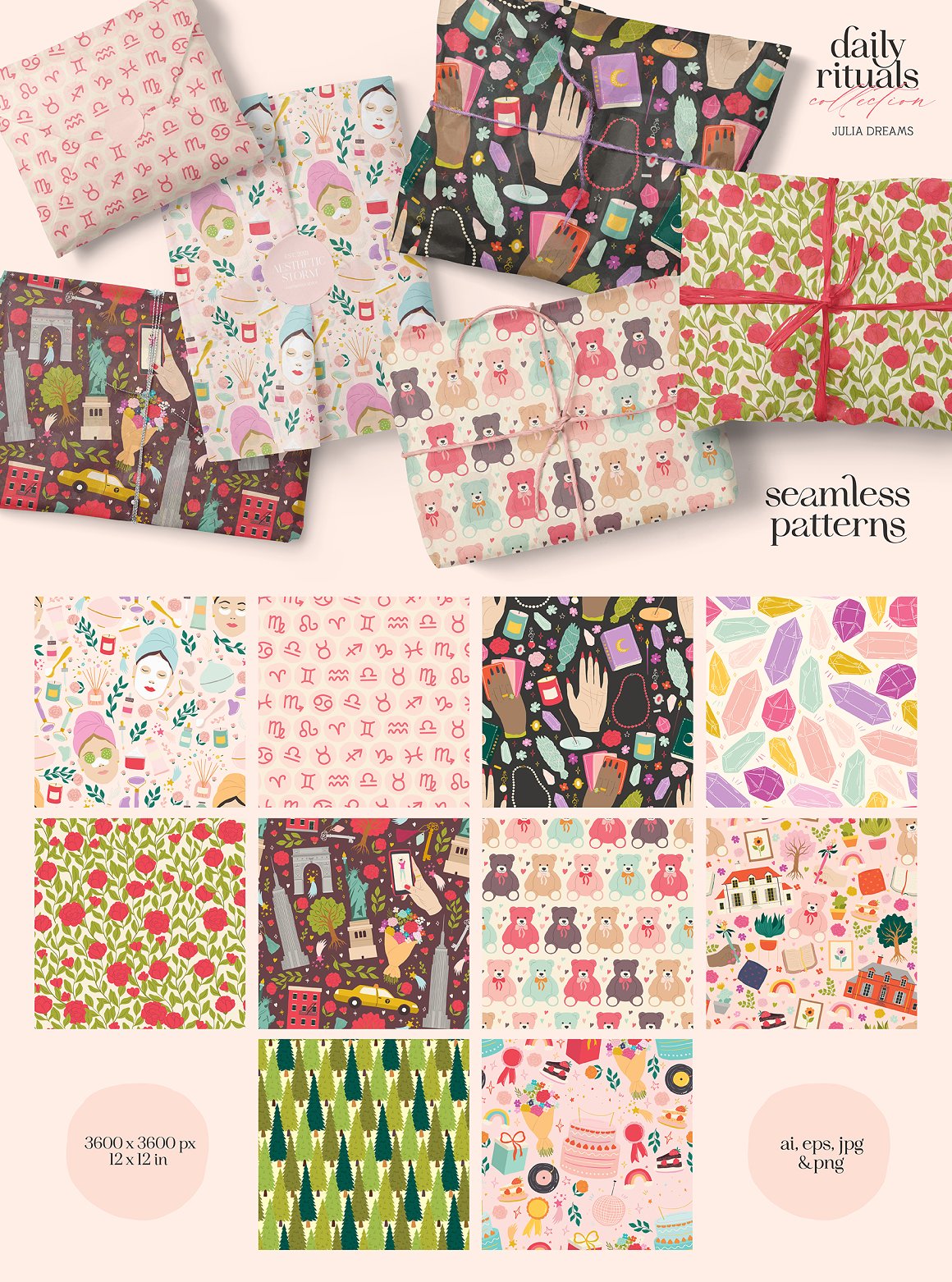 Daily Rituals Collection was carefully crafted and great attention was paid to details. It consists of different pre-made elements and seamless patterns that can be used individually or combined with other elements. Use ready-to-use prints and patterns or create your own individual product using all these elements.