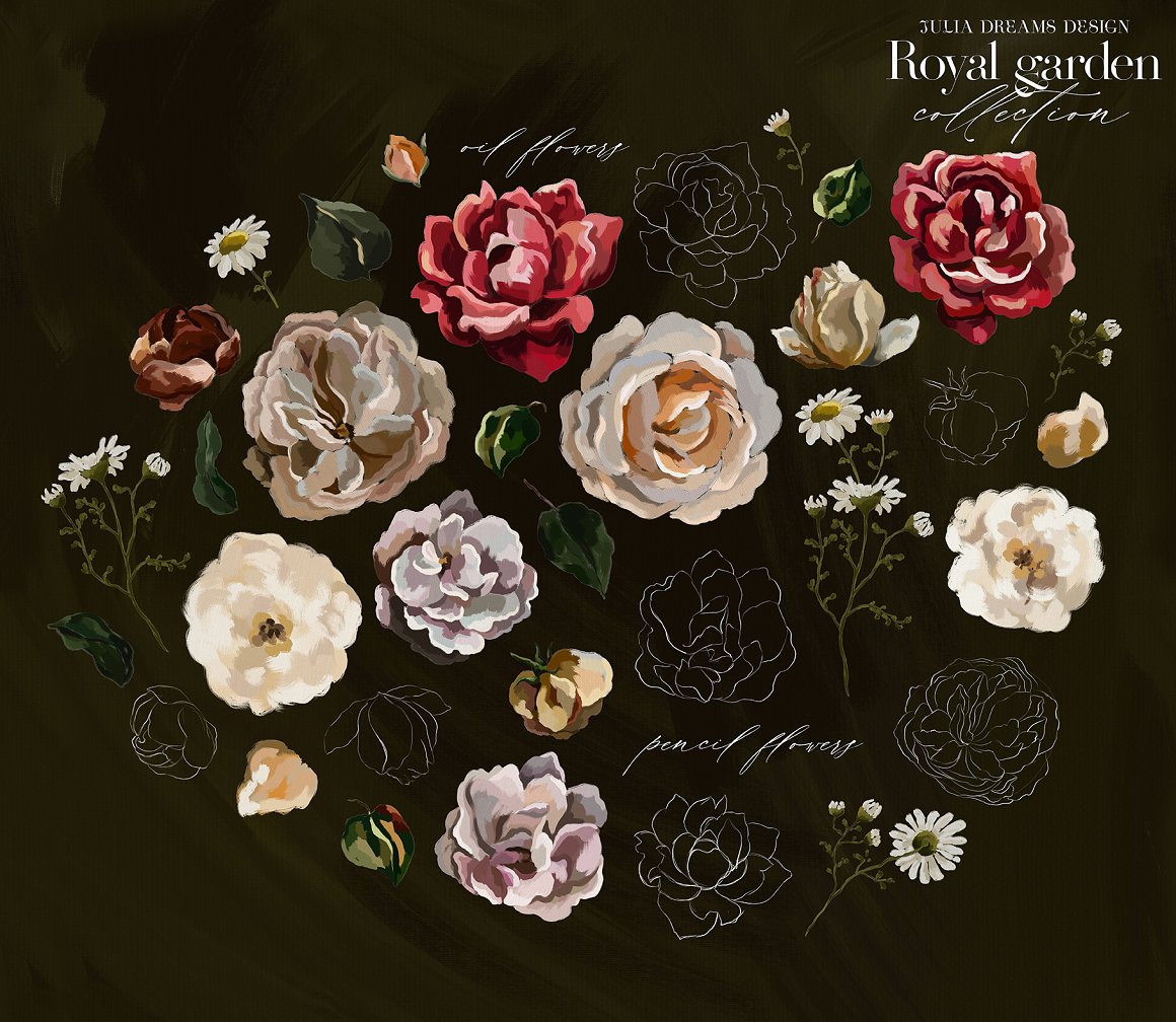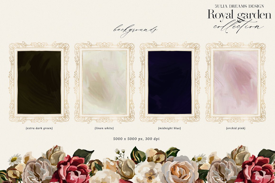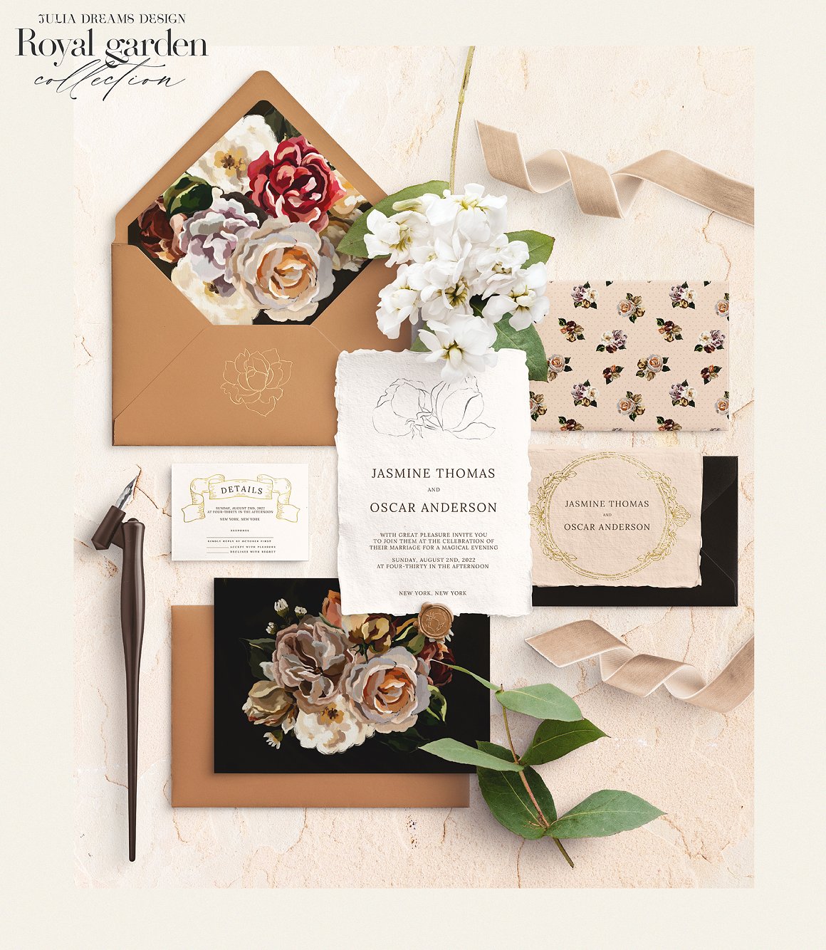 Royal Garden Collection great for wedding invites, wall art prints, greeting cards, gifts, logo, posters, cards, branding, planners, covers, social media accounts, wrapping paper, wallpaper, fabric, scrapbooking, stickers, sites, blogs, invitations and for many more.