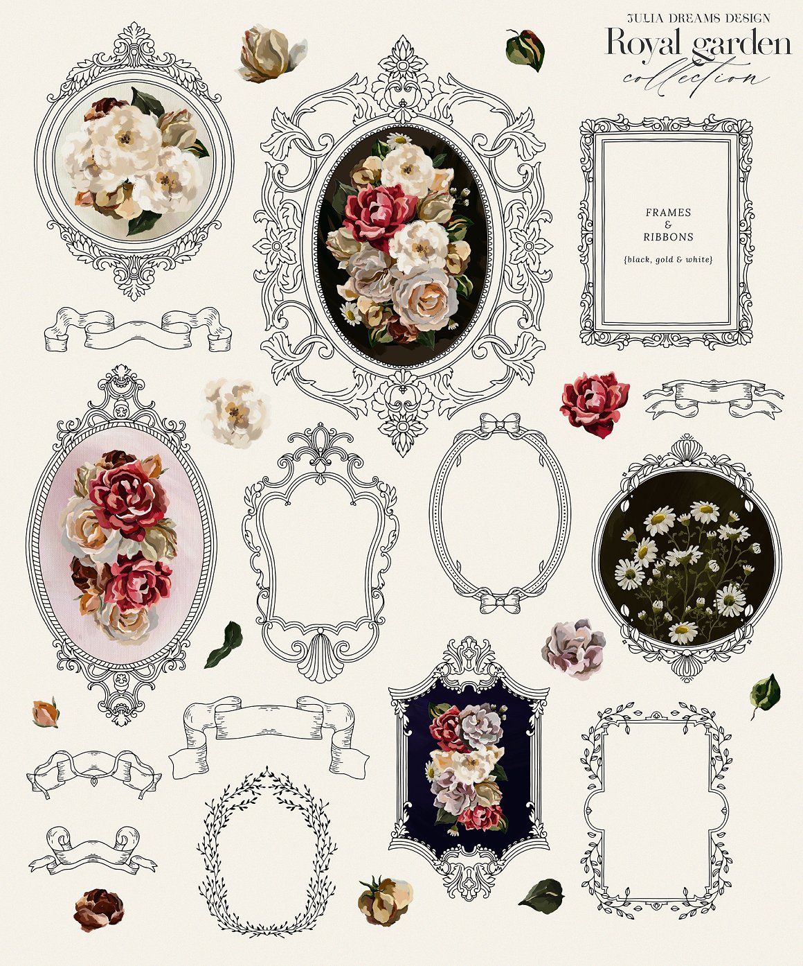 Inspired by the masterpieces of the masters of painting, I created an elegant and blooming collection with a magical selection of oil-painted flowers, textures, vintage frames, decorative elements and more.