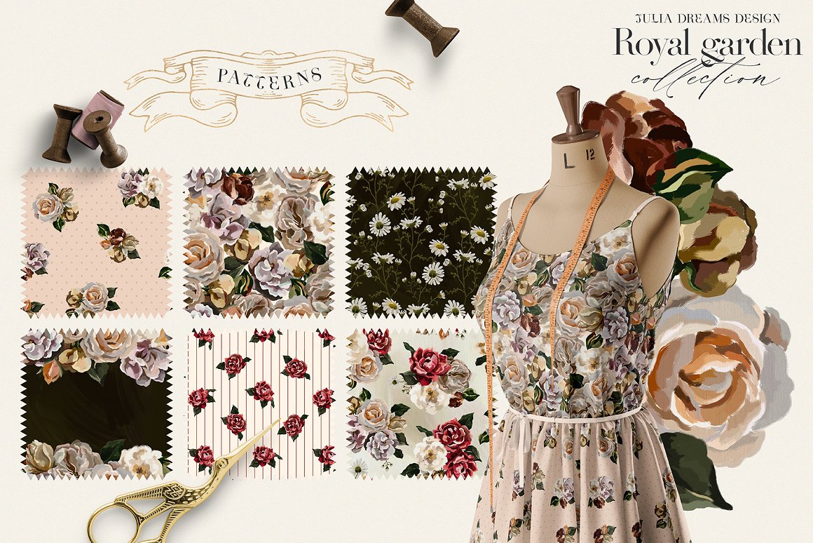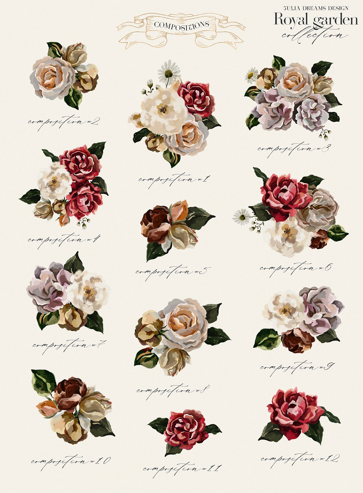 Royal Garden collection includes all the necessary elements for creativity and complete design. If necessary, you can use a ready-made design, such as flower arrangements and patterns, or create your own according to the conditions of your project.