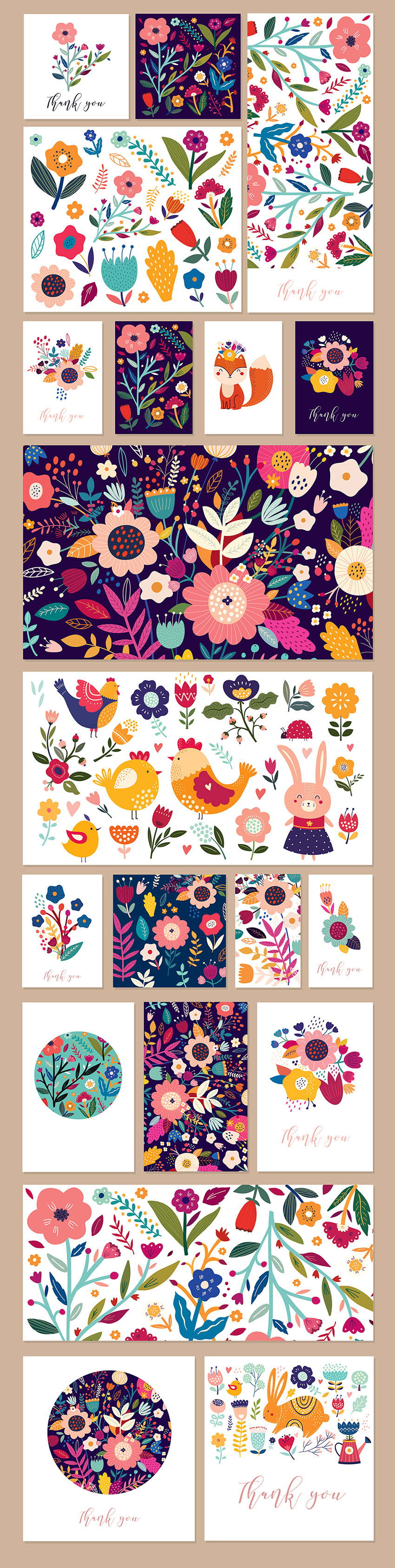 This collection included Happy Easter greeting cards, cute characters, tags, banners, labels decorative elements, symbols, seamless patterns with cute bunnies, chicks, Easter eggs and flowers. Amazing spring floral posters with flower bouquets.