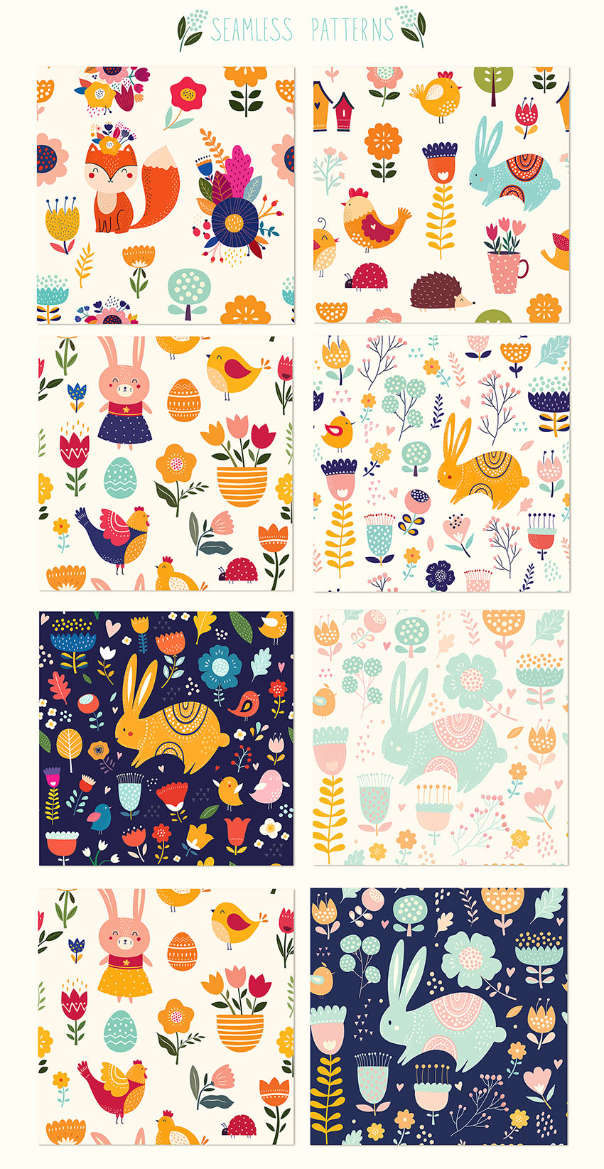- 8 Seamless patterns with cute bunnies, flowers and chicks (Illustrator Cs, Eps 10, Jpg 300 Dpi)