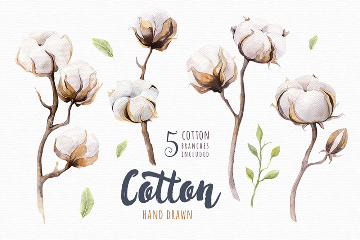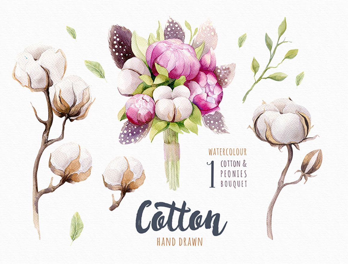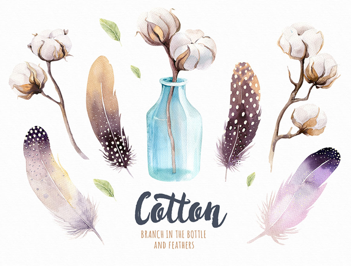 This set of high quality hand painted watercolor cotton elements. Boho style. Perfect graphic for DIY, wedding invitations, greeting cards, quotes, blogs, posters and more.