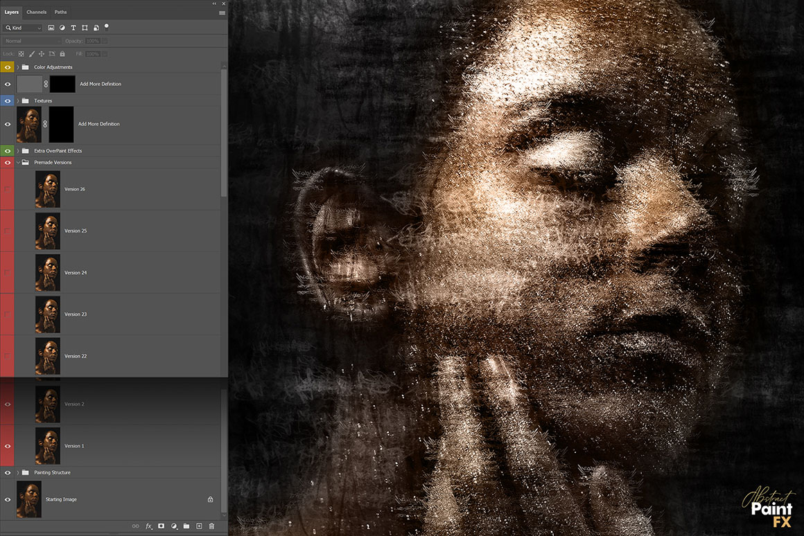 Choose from several options and high-end Variations! Once Abstract Paint FX has finished processing the Image we can choose from several options and create our own unique artwork! Customise the final result with 60+ High Quality Brushes and a million possibilities in the .psd file!