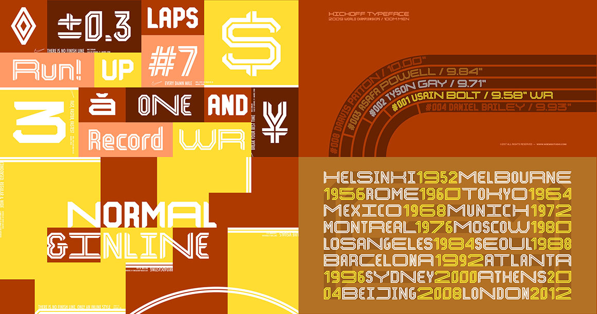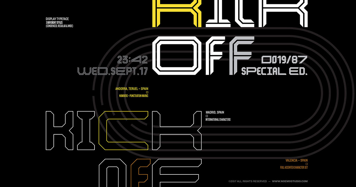 Kickoff is a display typeface with a geometric structure inspired by Sports graphics of the 70s. Its potential is increased with Normal & Inline styles which offer different moods. It comes in 3 different widths: Condensed, Regular & Wide that you can select depending on your needs.