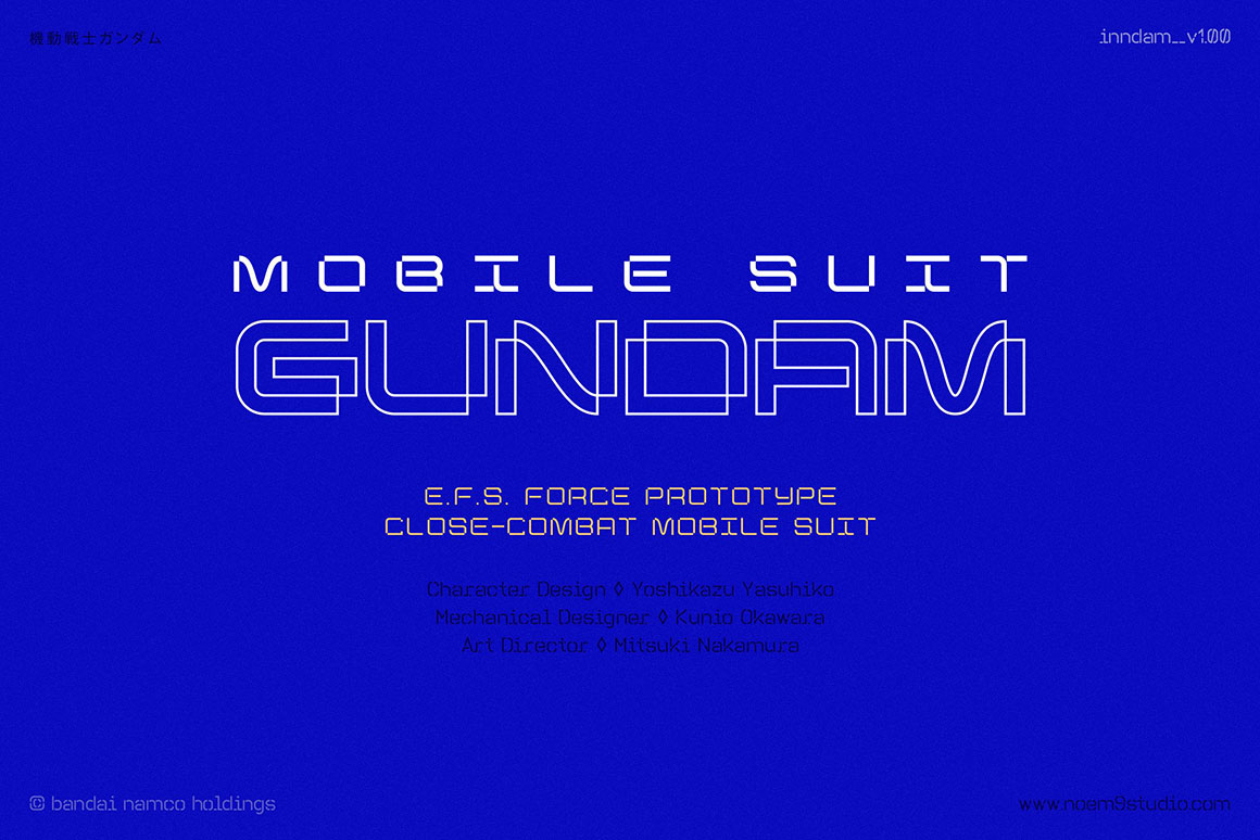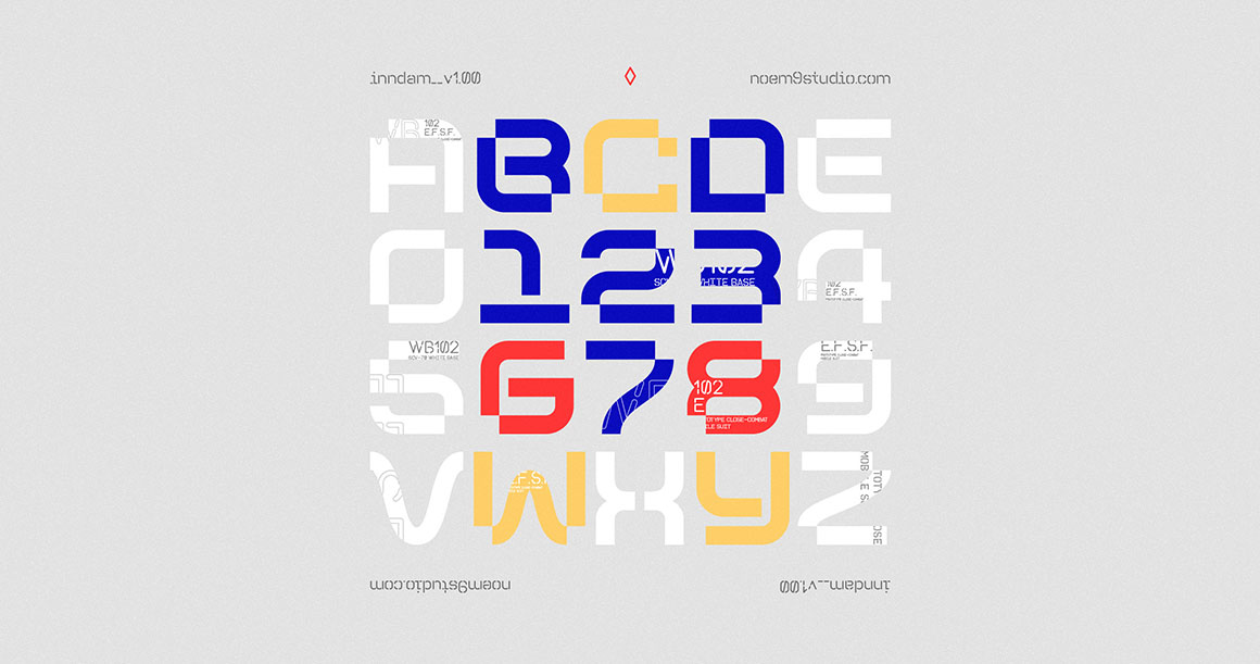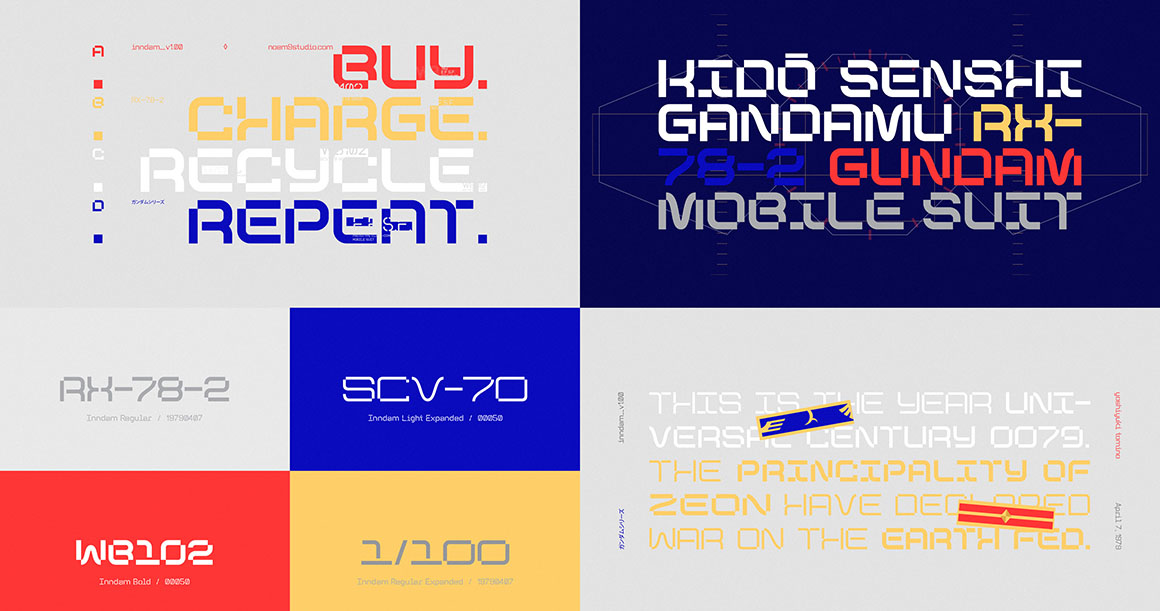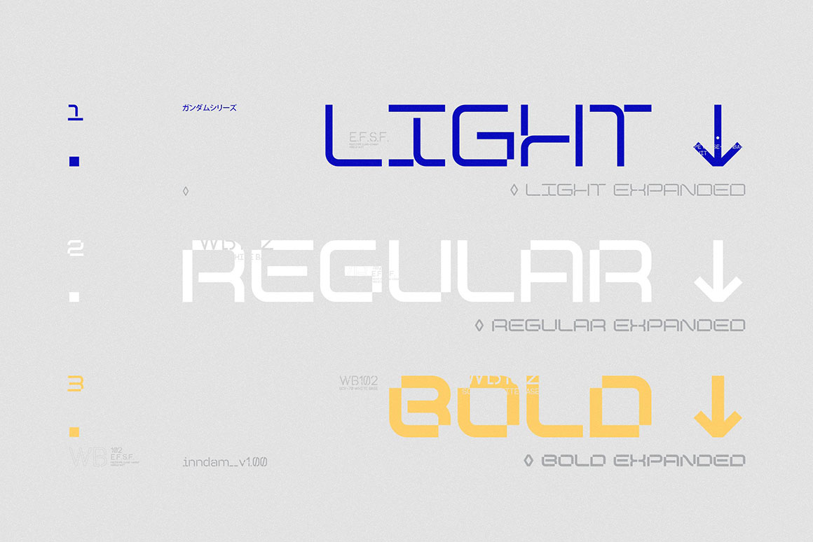 Inndam is a display typeface with a geometric structure inspired by sci-fi and robots (mecha). Its potential is increased with the Normal & Extended widths which offer different moods. It comes in 3 different weights: Light, Regular & Bold that you can select depending on your needs. Or use its variable options directly.