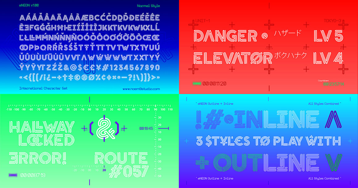 eNeon is a layered typeface with 3 styles that you can stack together to create as many different comps as you want. Inspired by neon signs and those tube shapes filled with gas that brighten the streets of so many cities. Smooth curves and stroke joints that simulate that ancient art of glass-blowing.