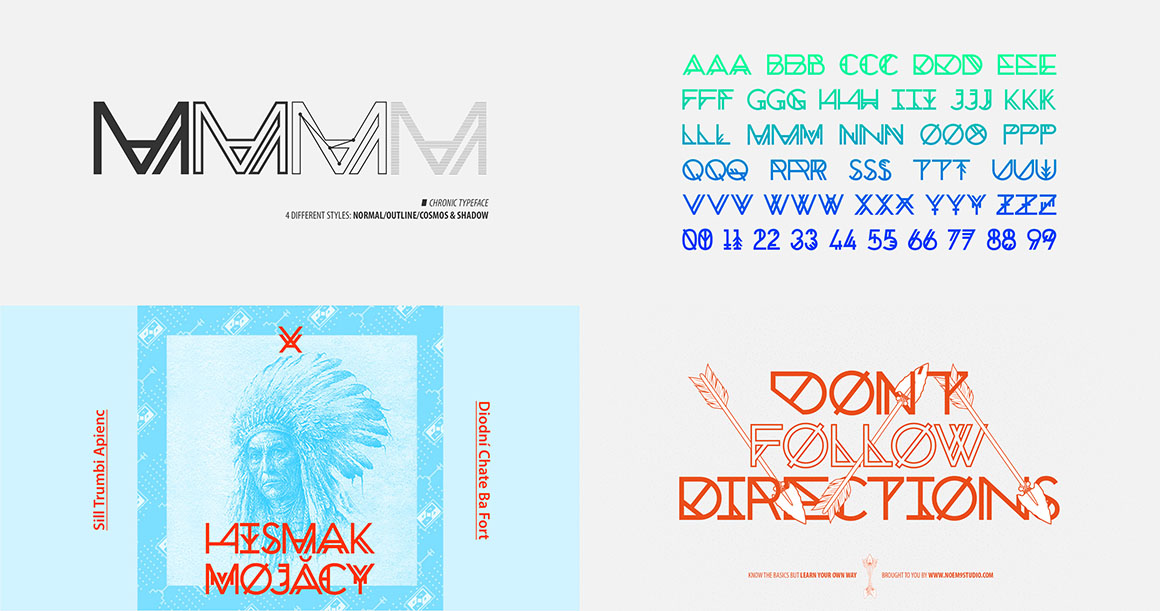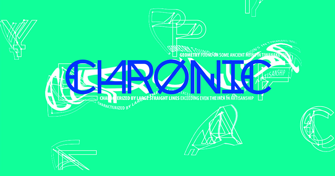 Chronic is a typeface inspired by Native American Legends & Geometry. Created as an experimental typeface featuring: