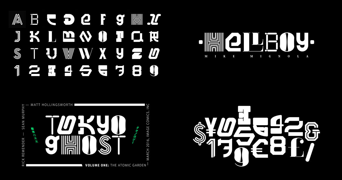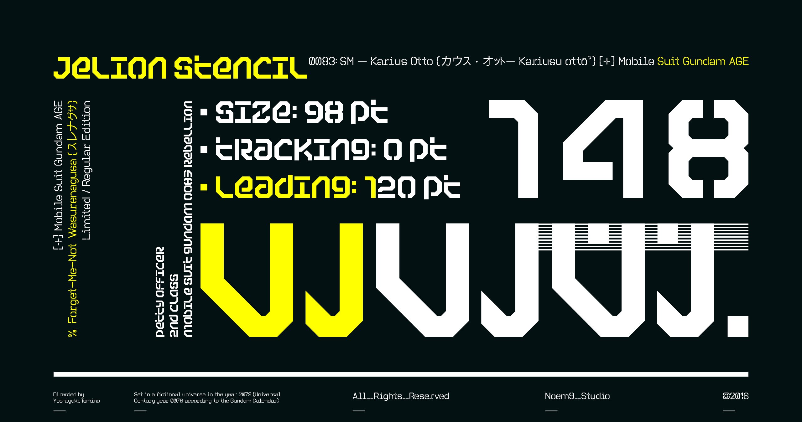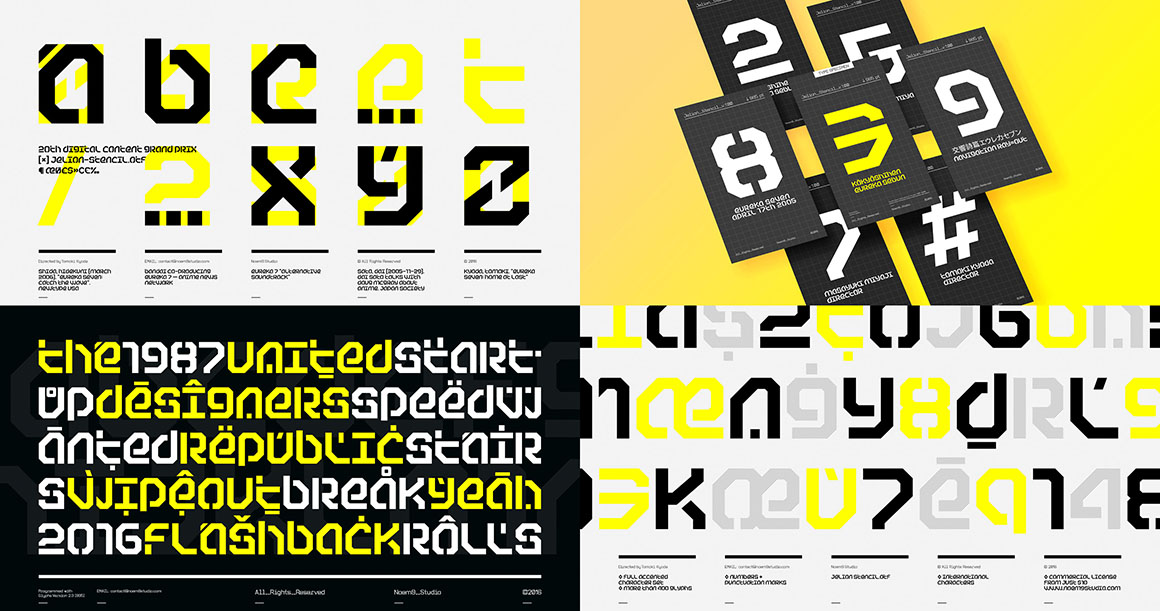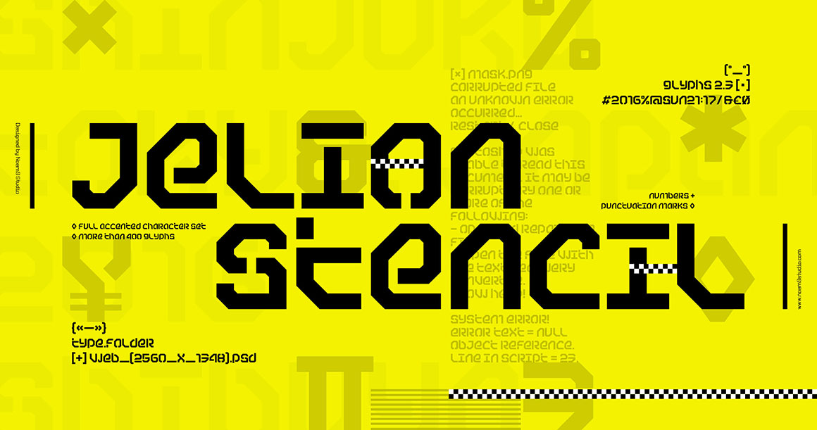 Jelion Stencil was created inspired by mecha animes and that iconic style that TDR created back in the 90s. It uses bold and geometric shapes that work great with tight spacing.