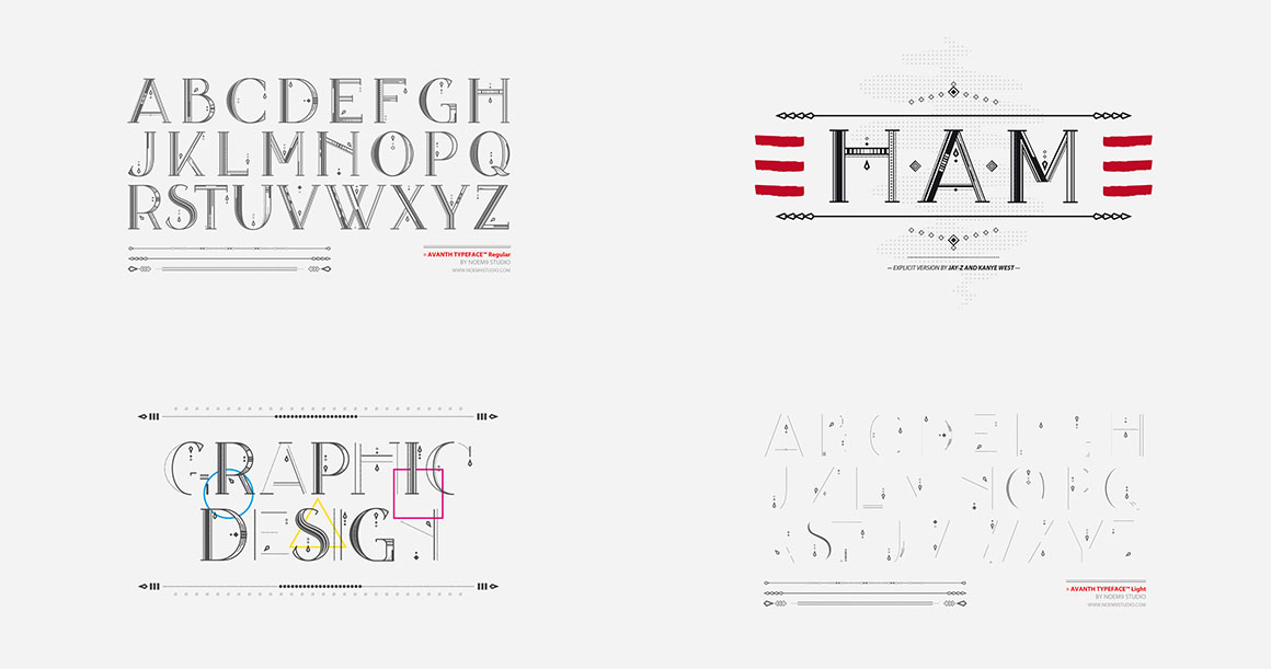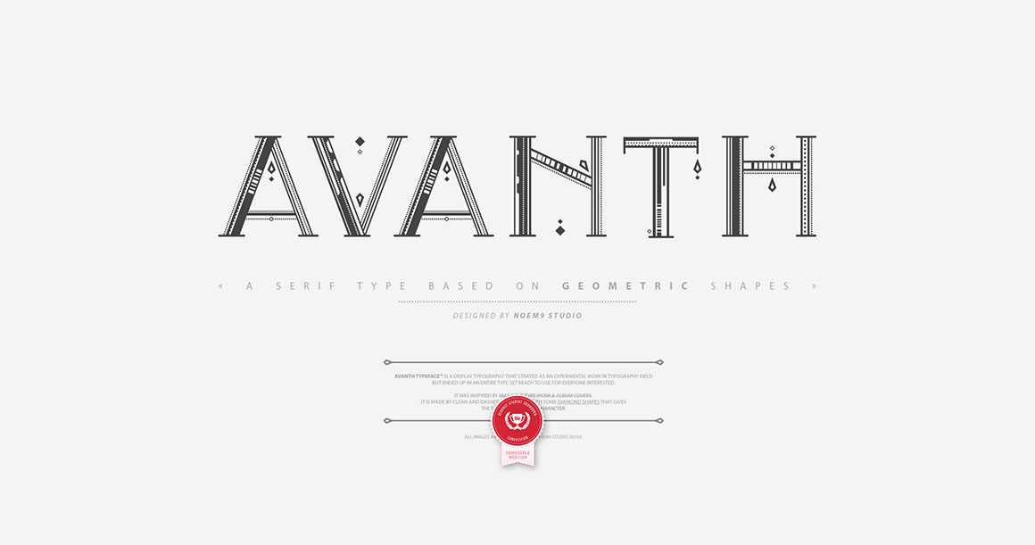 Avanth Typeface was born from the search of a display typeface to use in titles with a real personality, but trying to keep it legible in big sizes. Its own personality is based on small details in each letter (unique in each one of them) using just geometric simple shapes like circles, squares and straight lines.