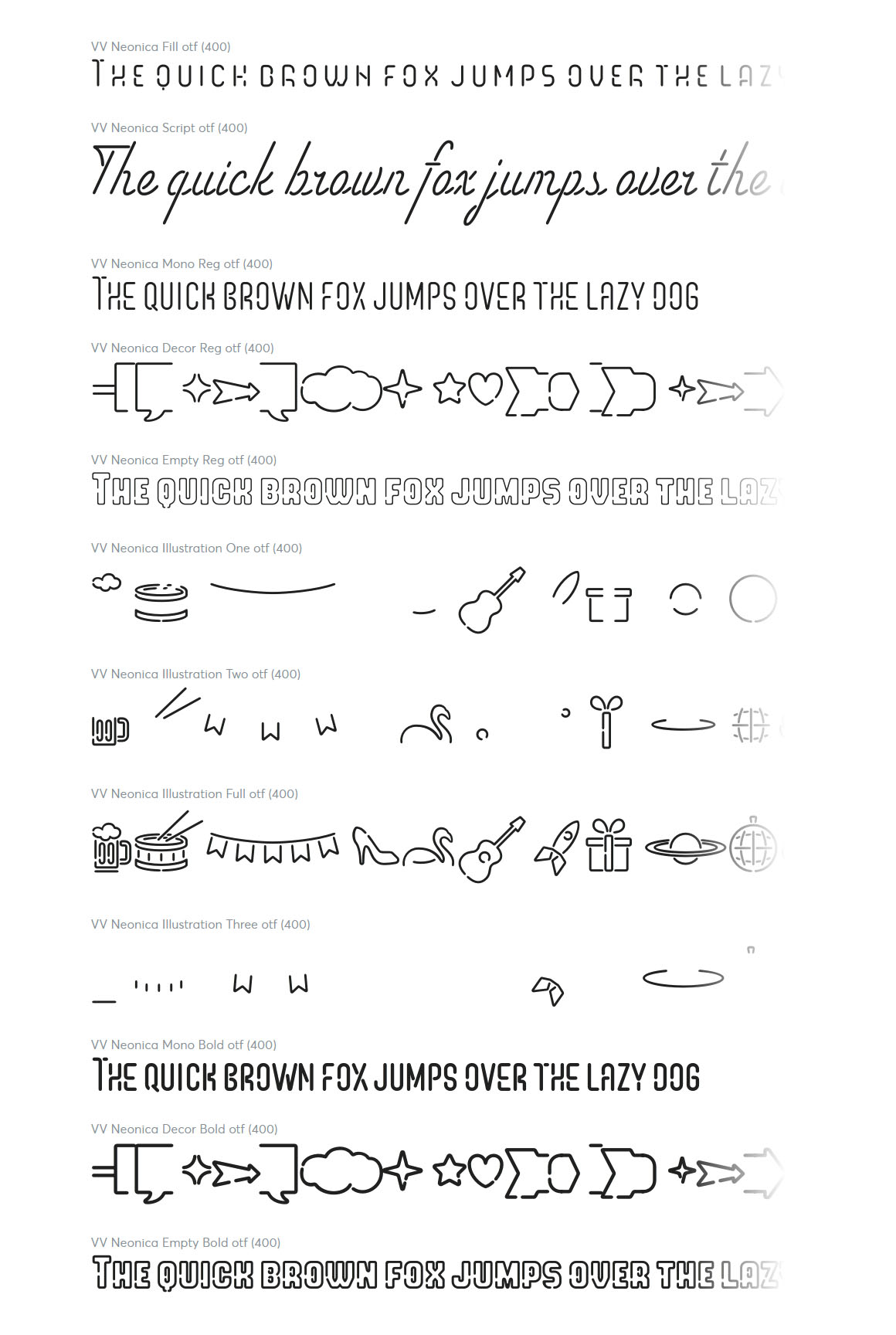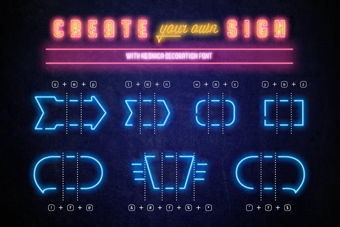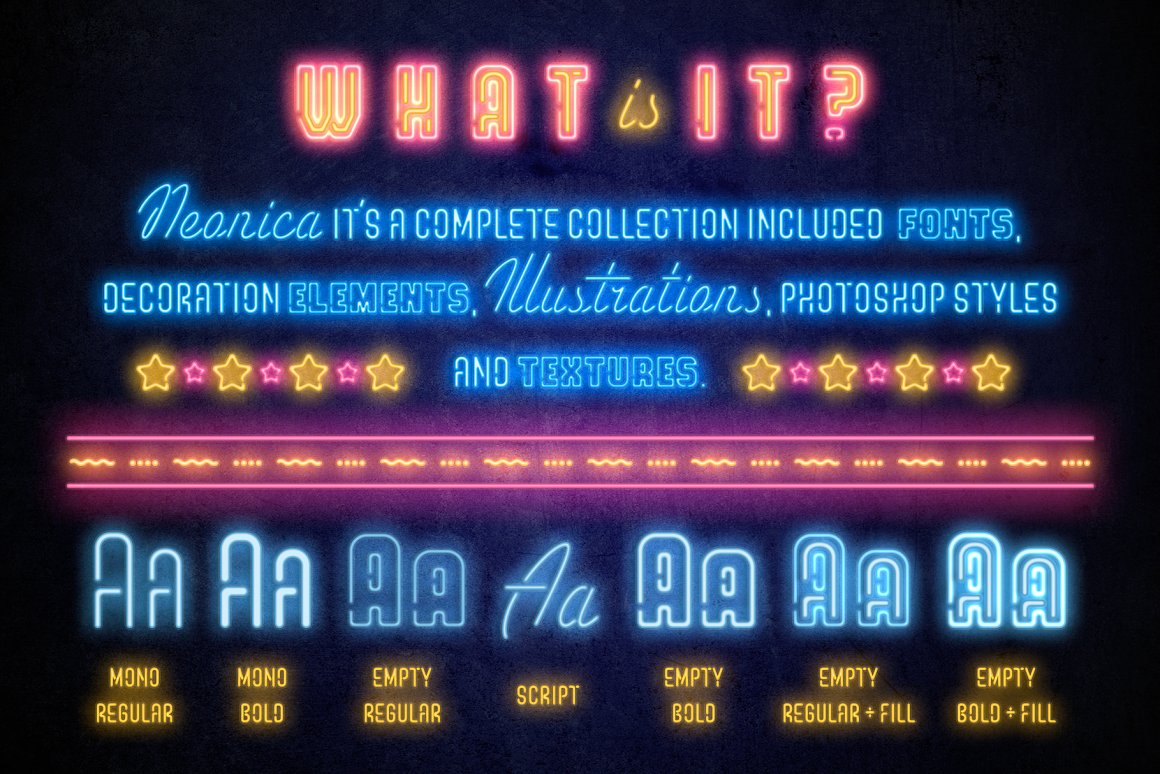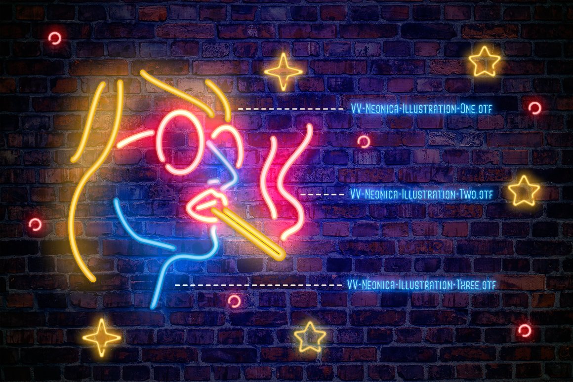 VV Neonica contains mono lined sans, volumetric sans with inline font option and mono lined script. Also, you’ll get the decoration and illustration fonts. Create your own neon signs or add the decoration to your neon graphic. The illustration font has one color or up to three color options. That mean you’ll be able to create a full color neon illustration graphic for few seconds!