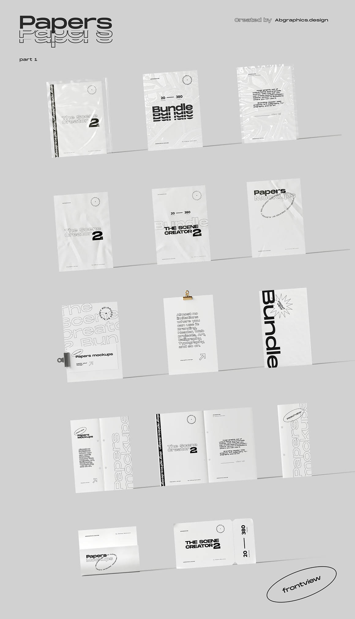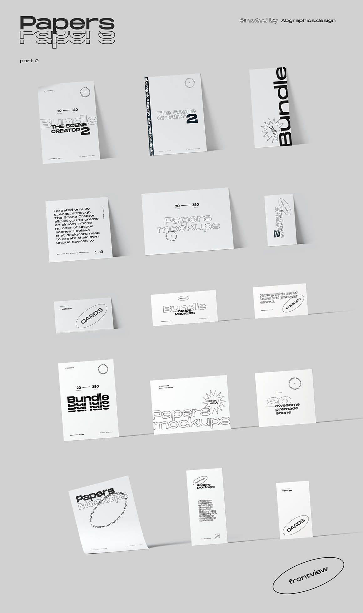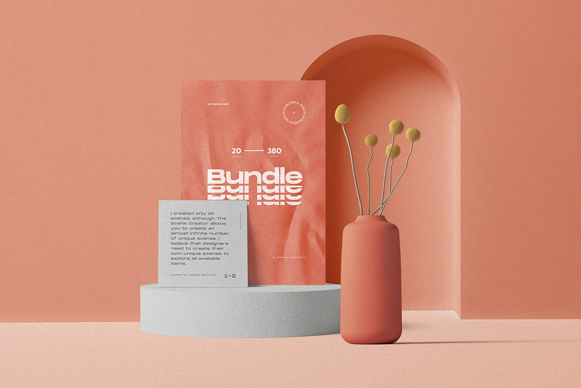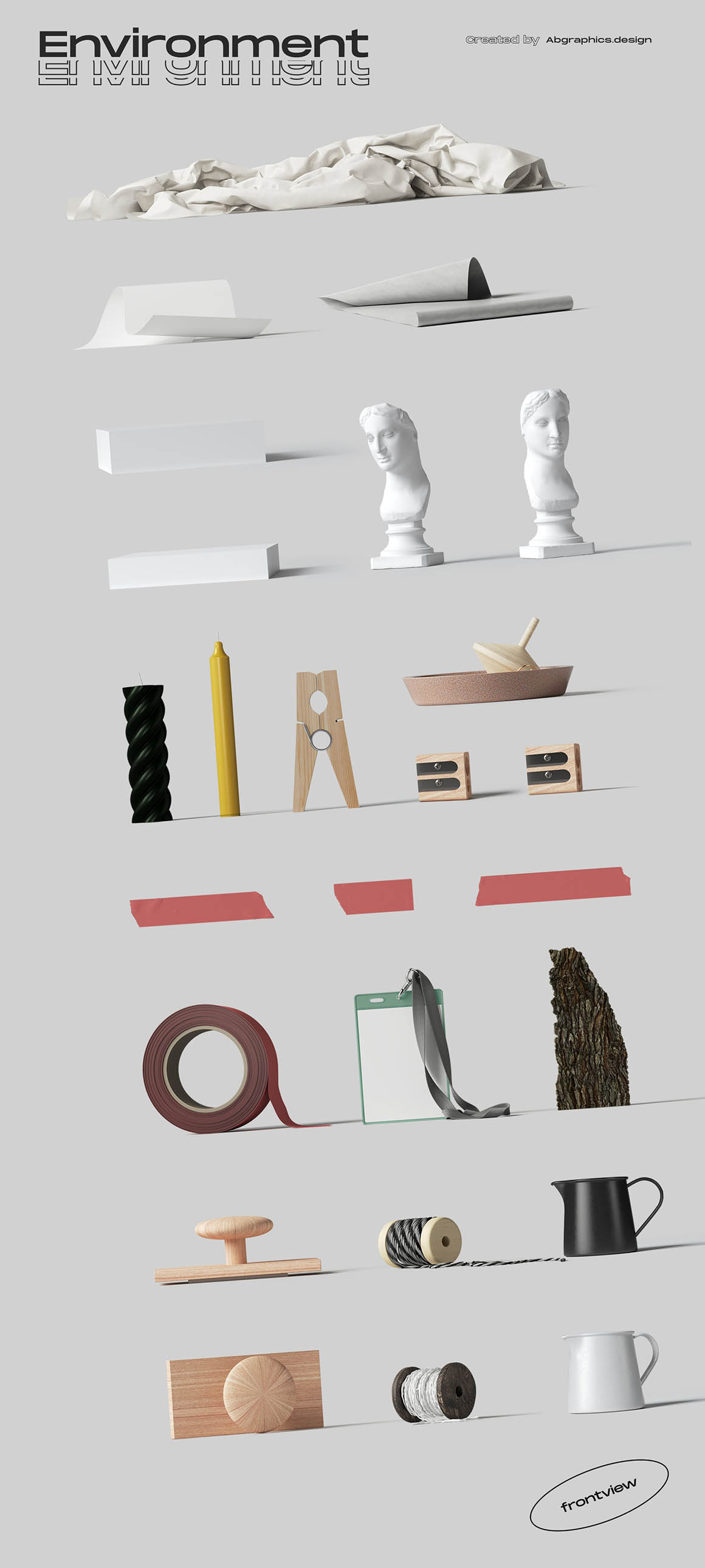 If you are looking for some professional 3D style scene creator for Adobe Photoshop with attractive FRONT view then you are at the right place because here you will get amazing bundle with 20 premade scenes & 380 unique items or mockups. Great for your branding, headers, web projects, art projects, typography or any print projets!