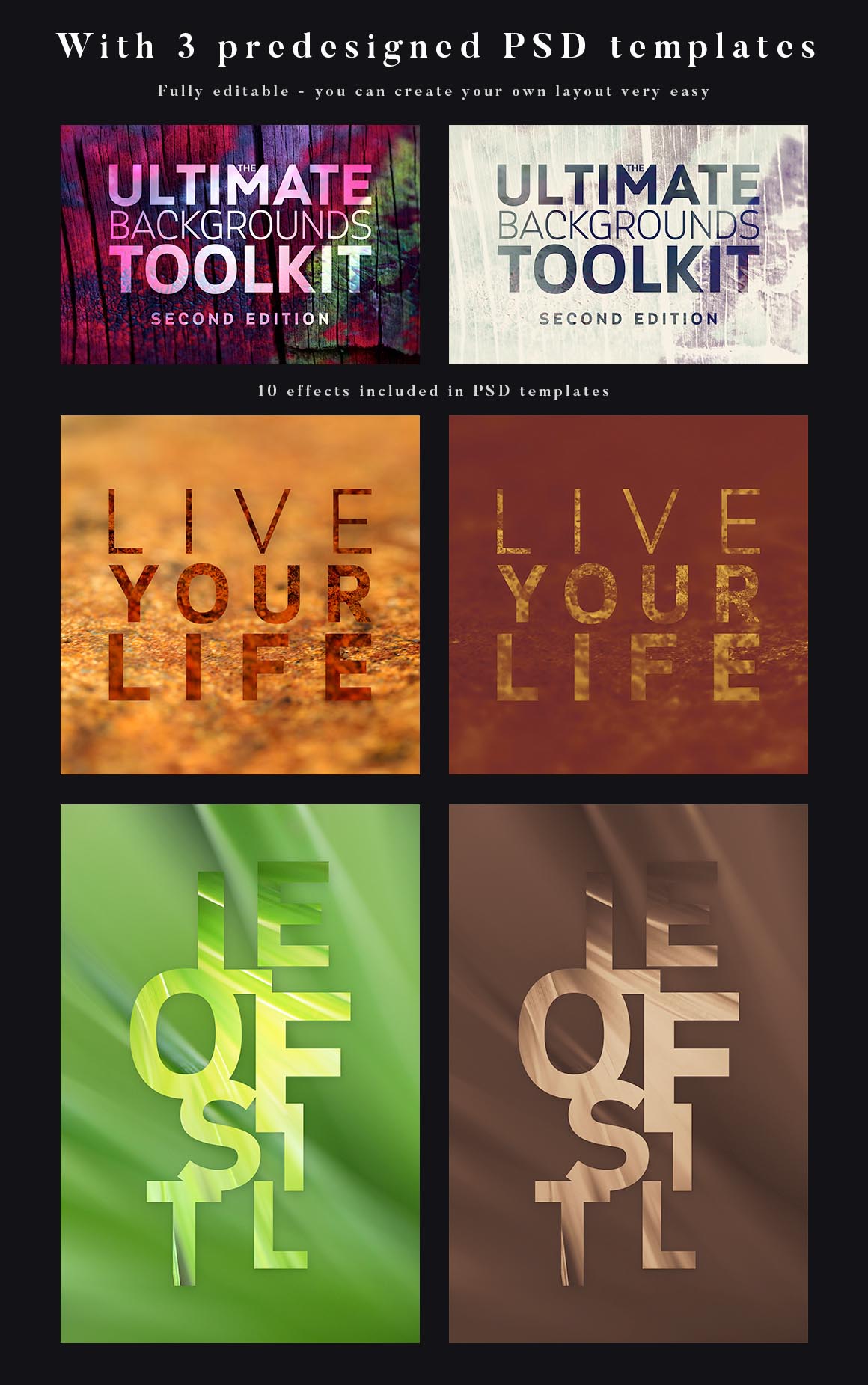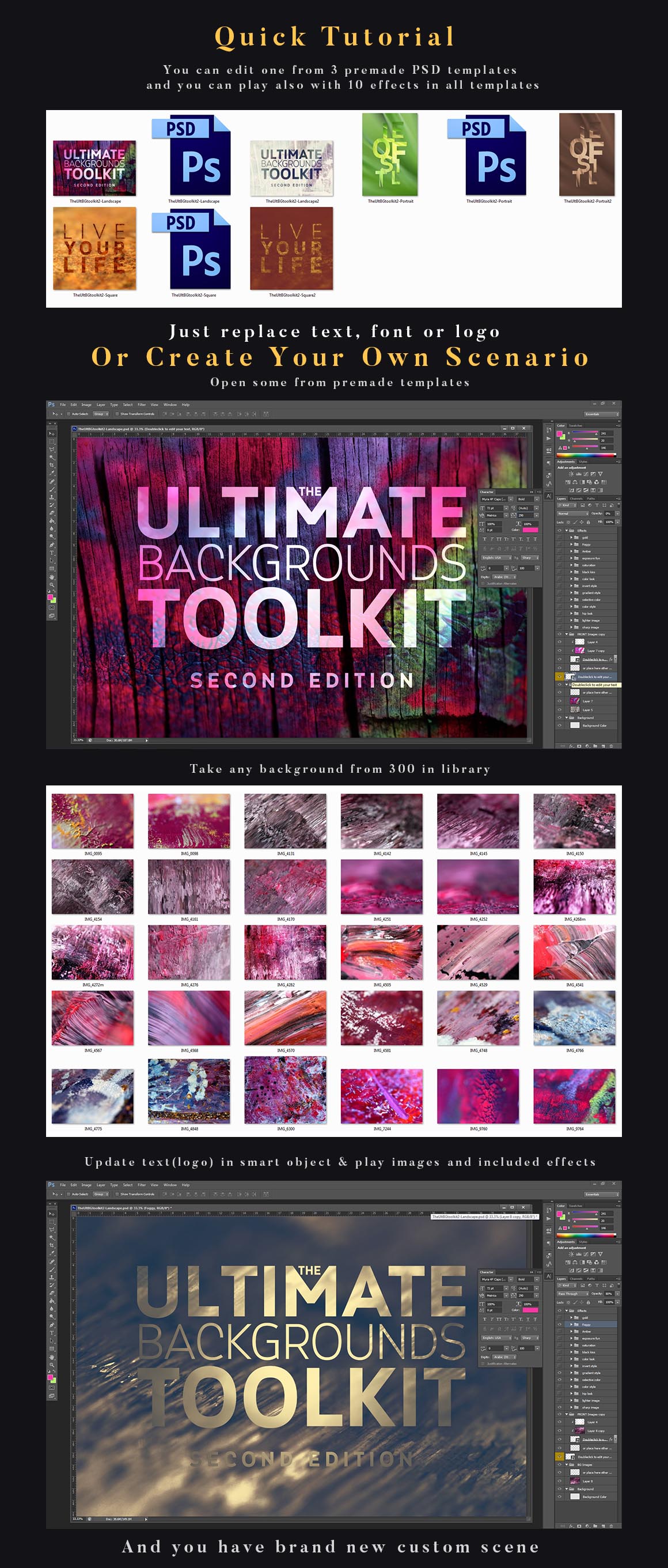 You can edit any from 3 PSD templates included in this bundle. Just edit smart object and update your text, font or logo…After you can play with backgrounds and 10 effects included in all templates. Enjoy 😉