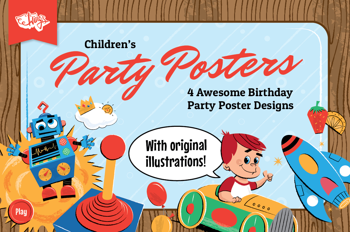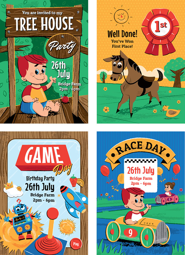 Customizable party posters with novelty themes featuring go karts, video games, ponies and an awesome tree house! Provided as fully editable vectors and layered psd files.