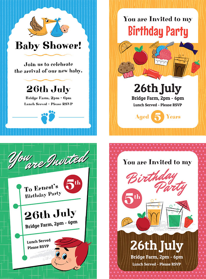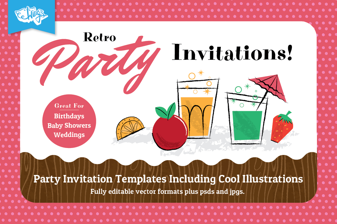 Customizable party invitation templates for birthdays, baby showers and more. Provided as fully editable vectors and layered psd files.