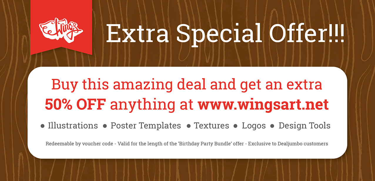 An exclusive offer for Dealjumbo.com customers and buyers this Birthday Party Bundle – not only do you get all of these great illustrations and design tools for an amazing price, you’ll also get an additional 50 percent off anything from the Wing’s Art and Design studio shop! From Hawaiian Prints and Tiki Idols, to Burlesque Posters and Art Deco graphics, this unique collection adds even more to your design arsenal with a special limited time voucher. Valid only for the length of this Dealjumbo offer, so take advantage of it now!
