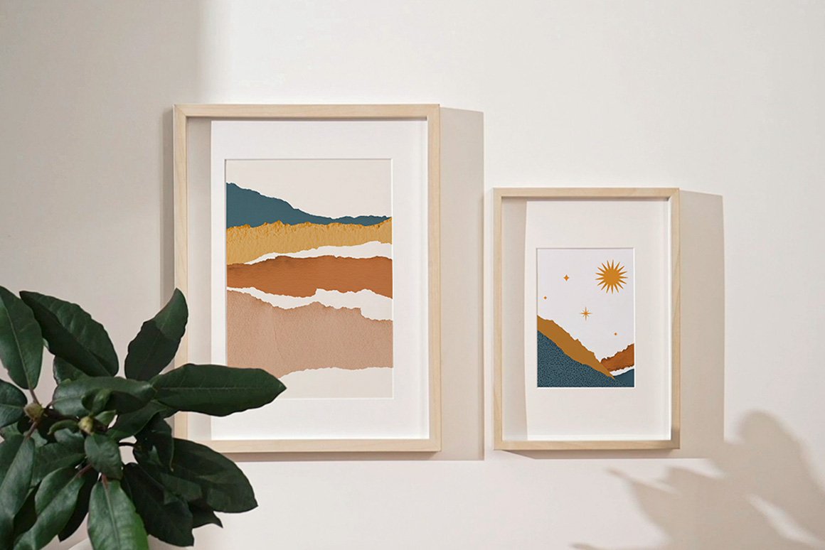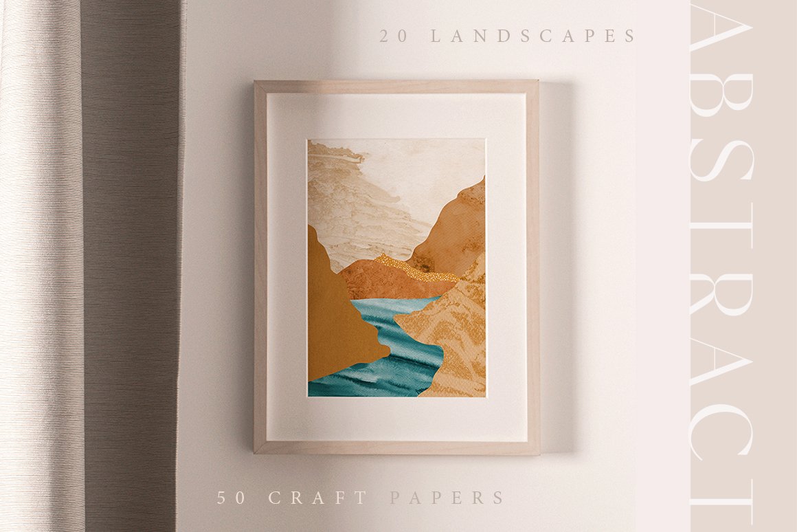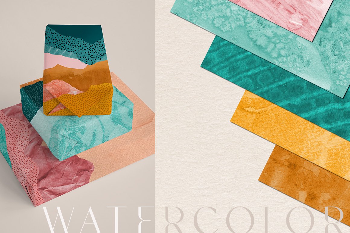 Abstract Landscape Watercolor Papers with abstract shapes and grunge textures, Ocean Blue, Pink and Earthy Colors