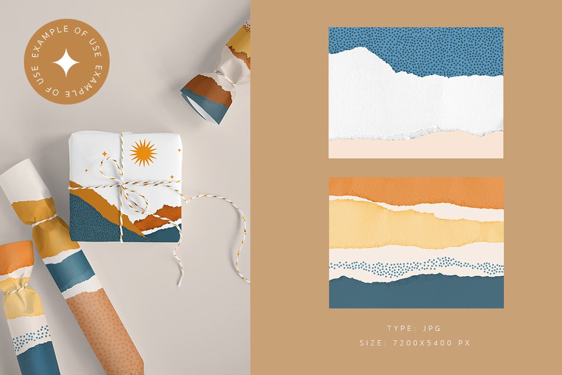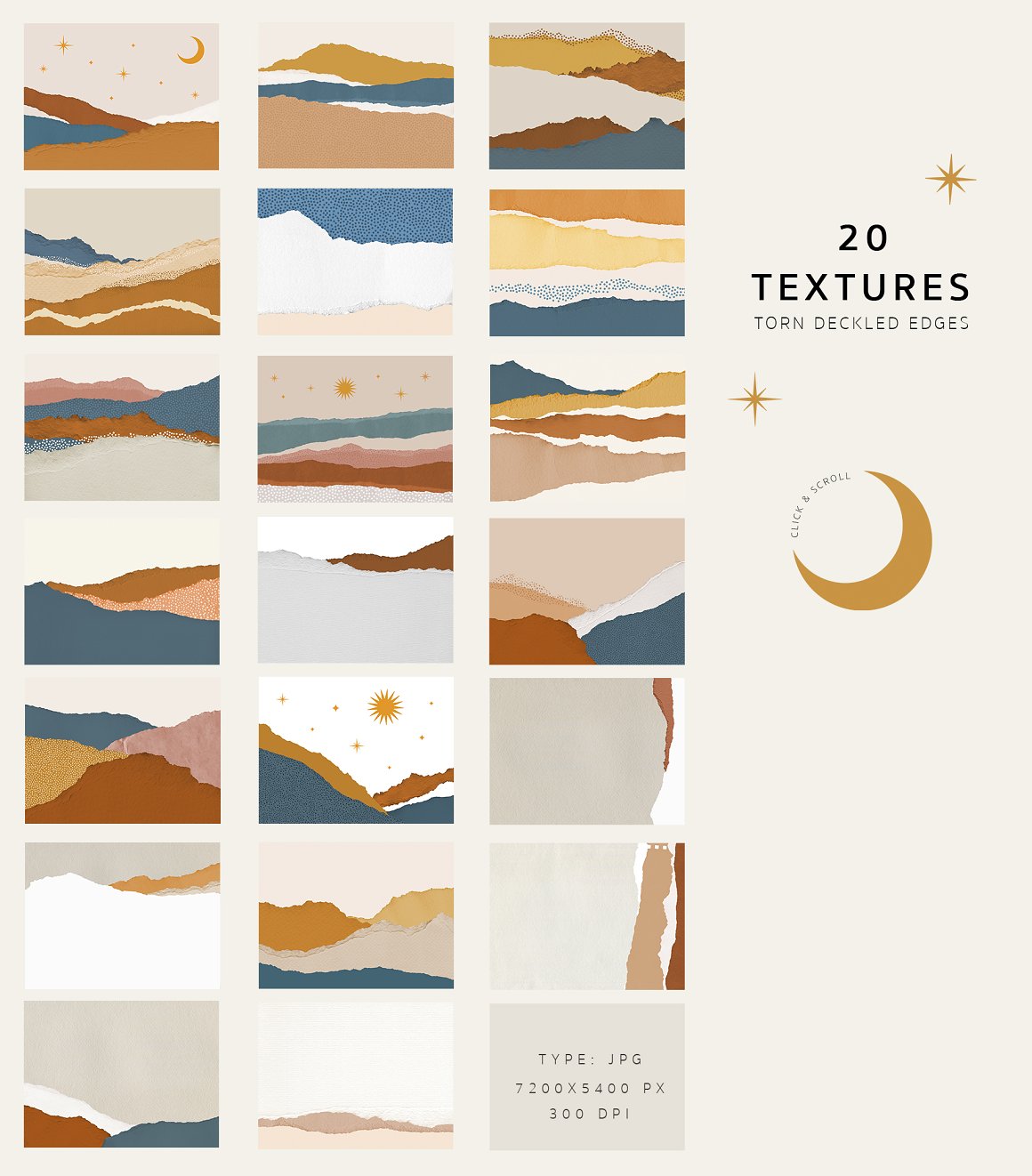 Abstract Torn Deckled Paper Edges– 68 paper tears and deckle edges, 20 creative textures and 7 additional decor celestial elements for your creativity and branding! Create your own textures and patterns with this collage paper tears set.