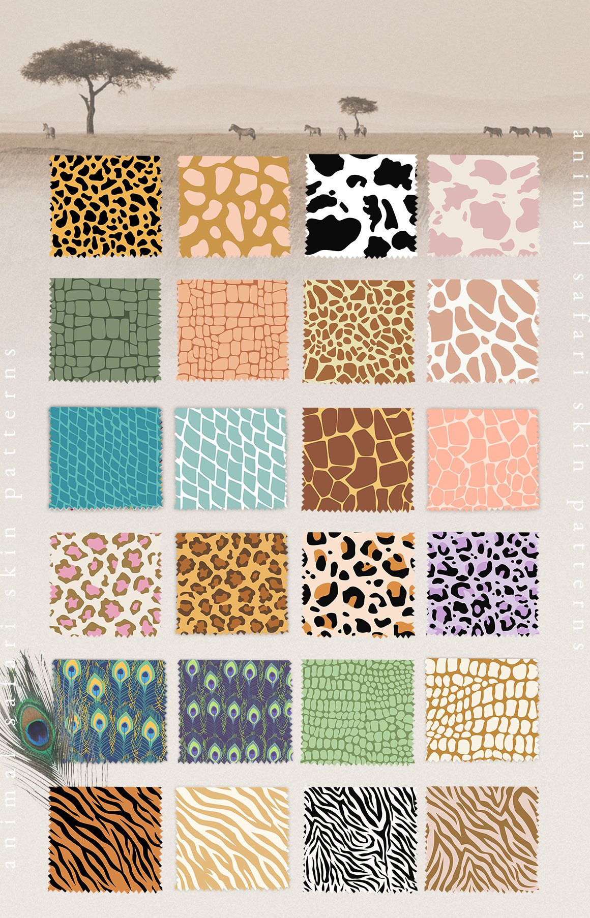 Safari animal skins that are included: Cheetah, Leopard, Tiger, Zebra, Snake, Cow, Peacock, Giraffe, Crocodile and Fish