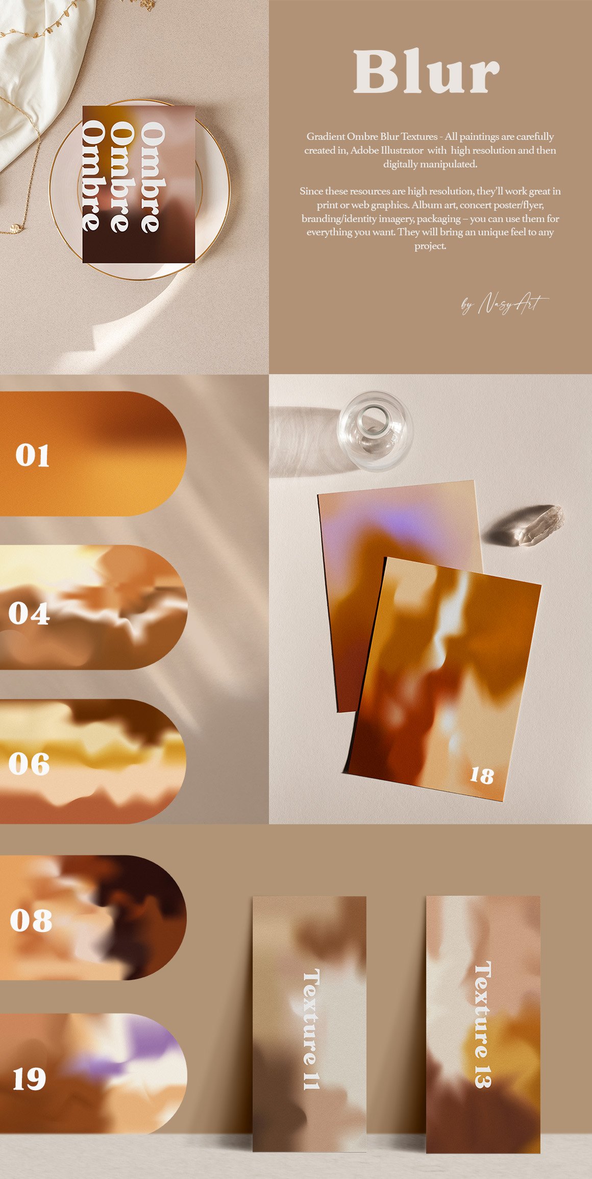 Gradient Ombre Blur Grainy Textures – collection of mustard, brown, beige and earthy natural shades with purple accent. Since these backgrounds are high-resolution, they’ll work great in print or web graphics. You can use these blur digital backgrounds for creating invitation letters, business cards, your own and commercial projects, card design, mockup textures, scrapbooking etc. This collection full of blur grainy papers is carefully prepared and created in a trendy earthy nude palette colors.
