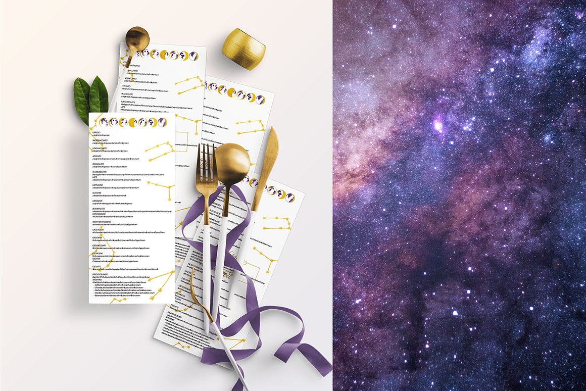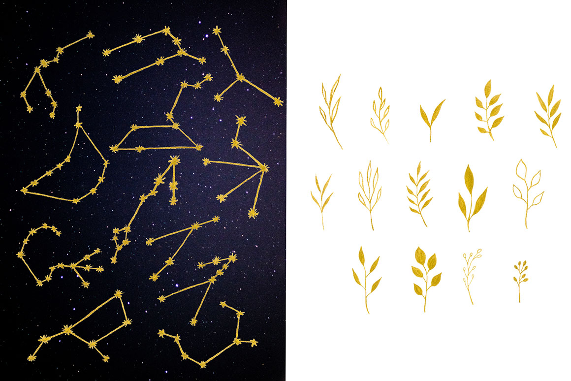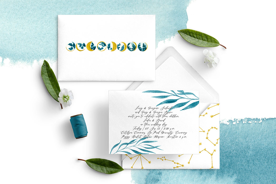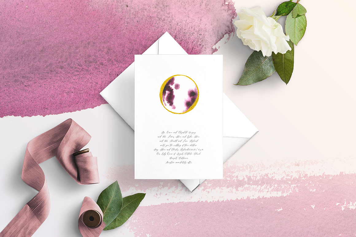Moon Inspiration design set filled watercolour dust pink moon, watercolour navy blue moon, watercolour black moon, watercolour amethyst moon, watercolour leaves 4 color, textures, gold leaves and zodiac.