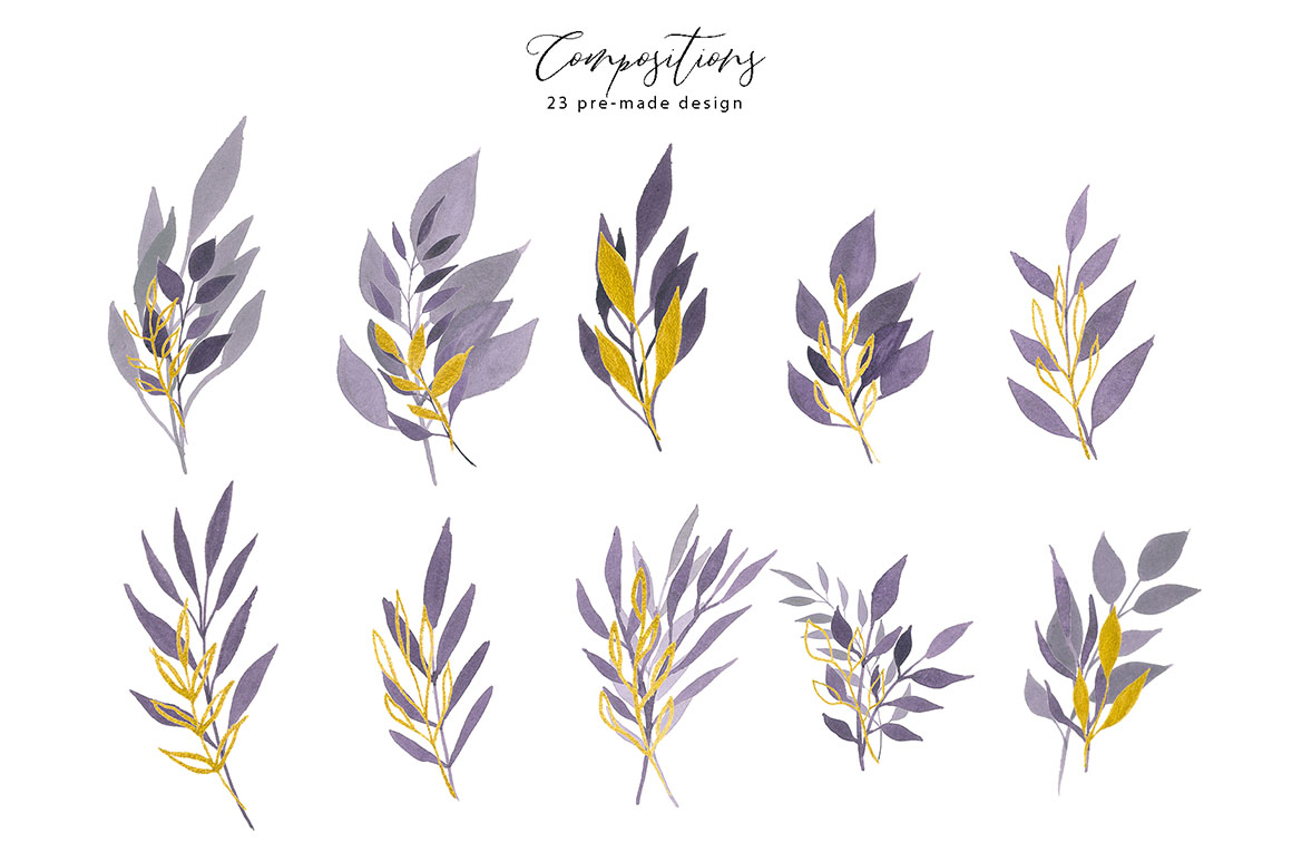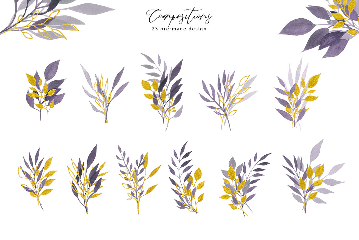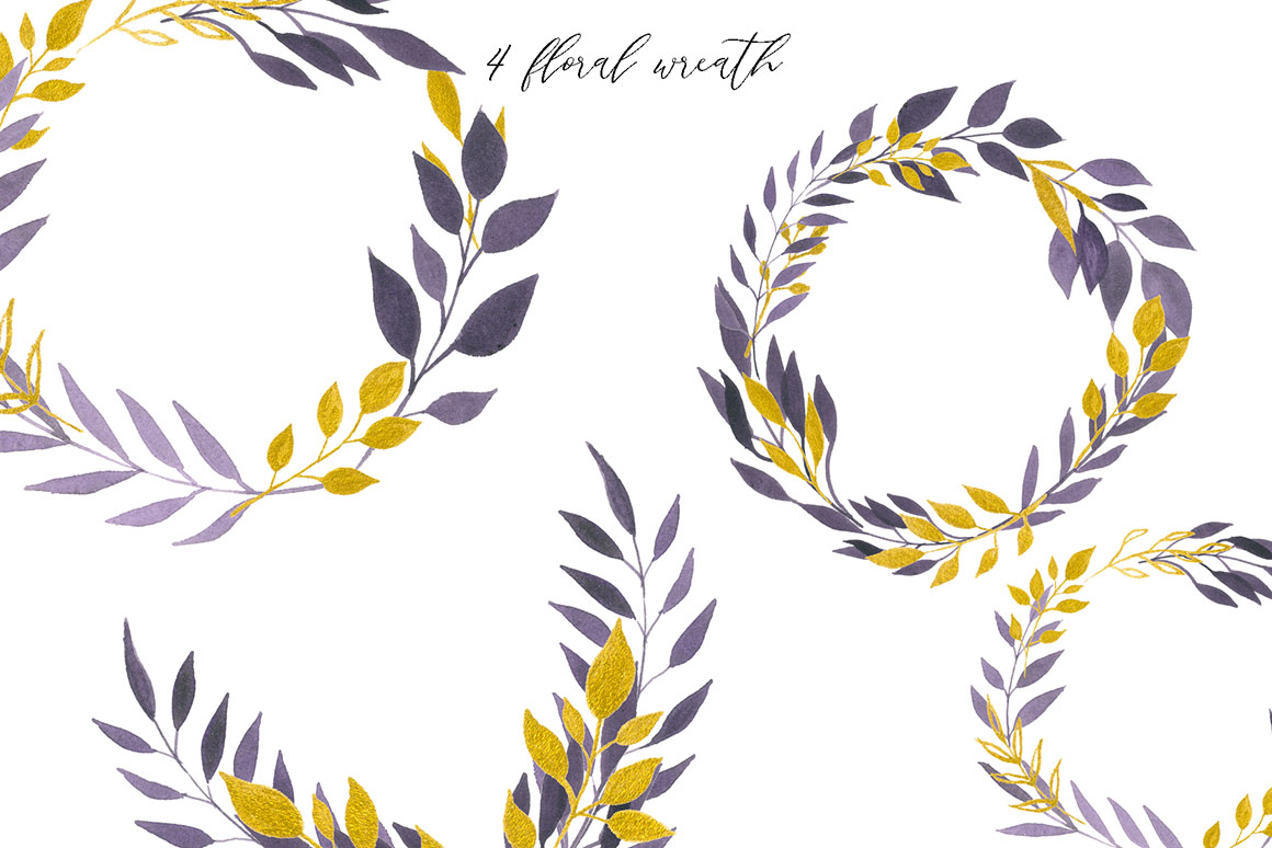Violet Dream design set filled with individual watercolour design elements, violet and gold elements, arrangements, wreath, textures, gold and black alphabet, branches, and more.