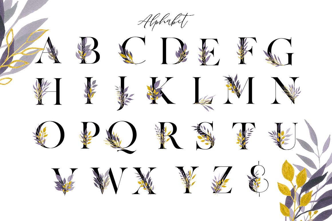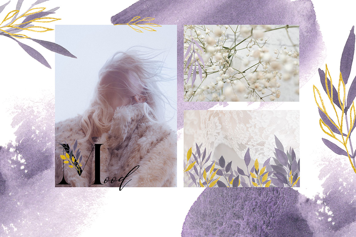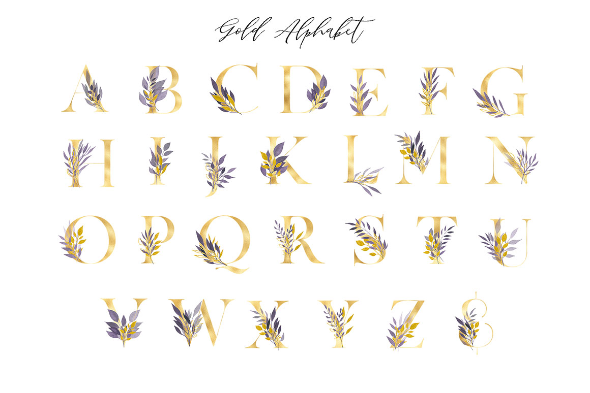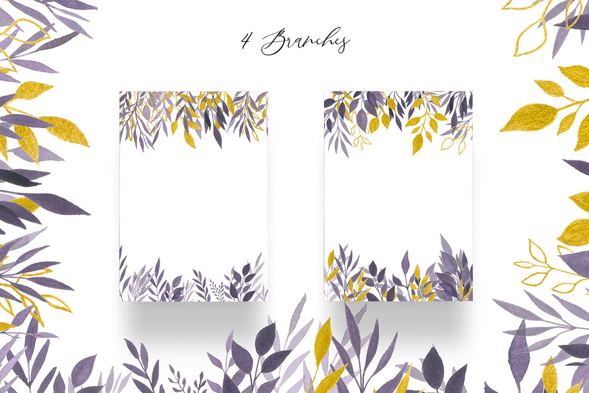 Violet Dream design set filled with individual watercolour design elements, violet and gold elements, arrangements, wreath, textures, gold and black alphabet, branches, and more.