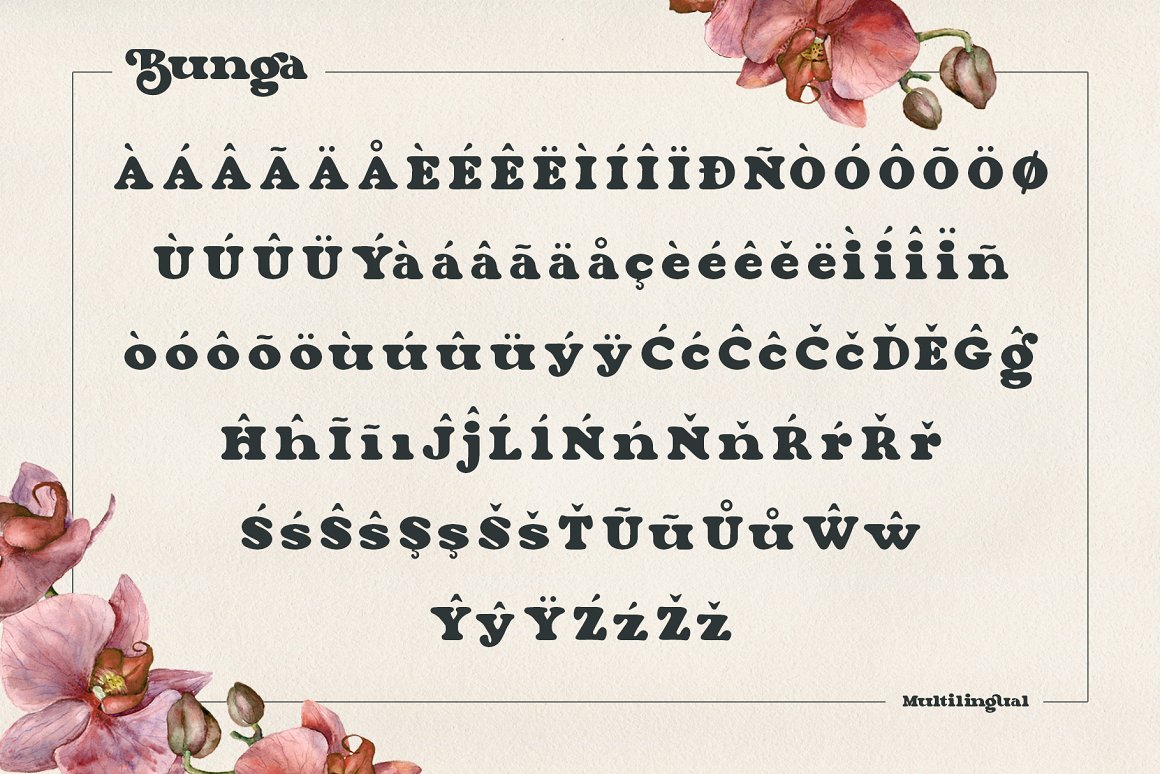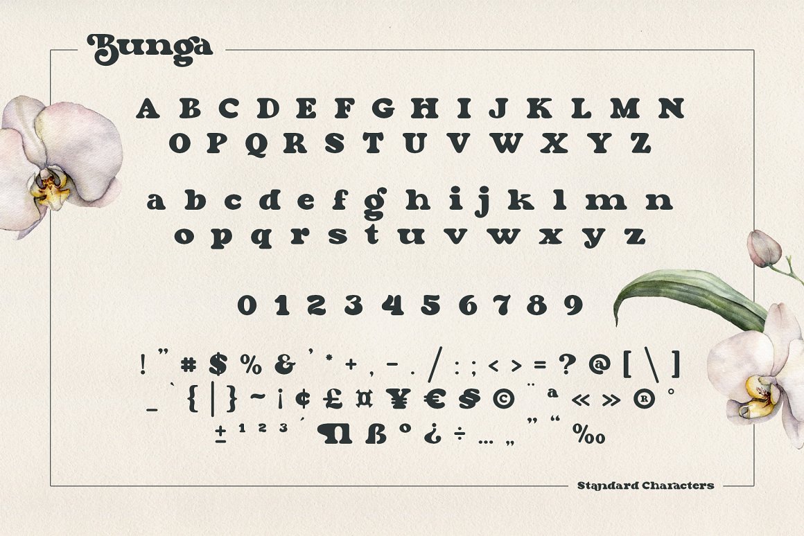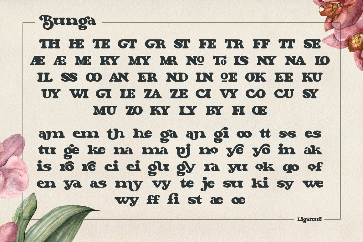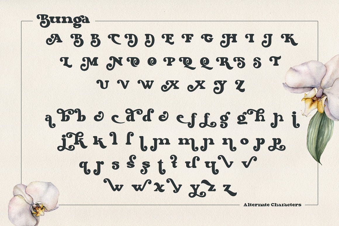 Say Hi to “Bunga”, inspired by the 70 – 80’s retro bold font that always used on that decade. We try to bring a beautifull time machine on the table, a great decade were you can saw many groovy and thick design. Fits perfectly into those nostalgic moodboards and vintage logos. POWERED WITH 5 WEIGHTS – Bunga Light, Bunga Regular, Bunga Semi Bold, Bunga Bold & Bunga Black. All characters are available through Glyph panel, even more each of the alternate letter has it’s own unicode (PUA) so you can copy/paste from Apple Font Book or Windows Character Map. OPENTYPE FEATURES – First lowercase (after a capital) and last letter swap automatically. You just need turn on Contextual Alternates. Usually Adobe Photoshop and other programs activate it by default.