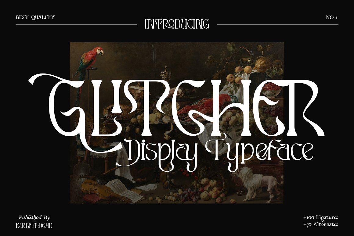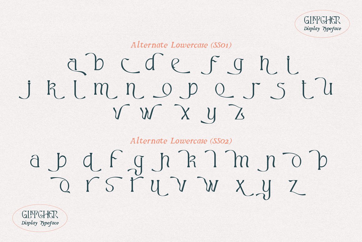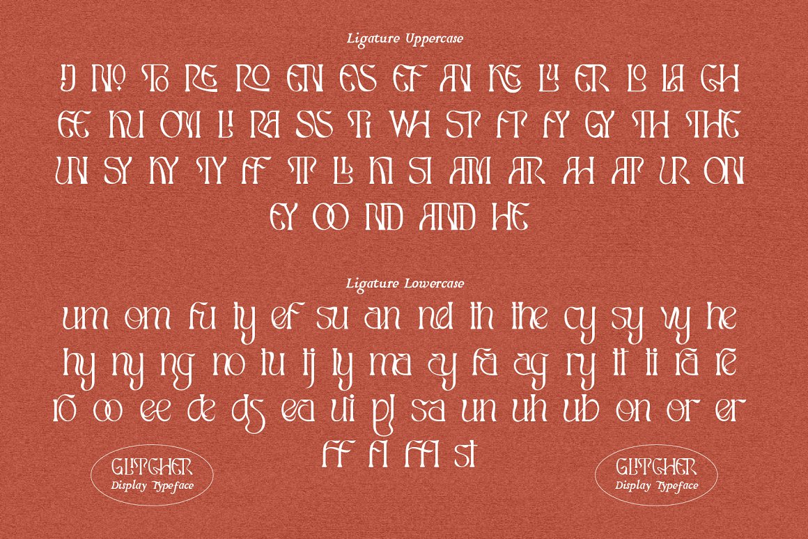 Proudley present “Glitcher” typeface. Powered with +100 ligatures to bring fluent combination & +70 alternate characters to get dynamic & more aesthetic looks. If your application does not feature a glyph palette, We also add the characters map in PDF to help you access hidden alternates available in our OpenType fonts. Simply chose the character on the PDF you want to use to your clipboard, then return to your application and paste while using the appropriate Glitcher font. Perfect and suitable for branding, headline, logotype, sticker, editorial design, and etc.