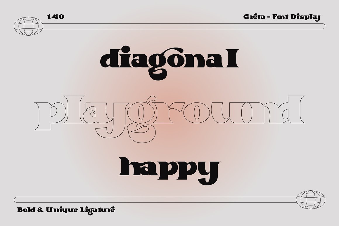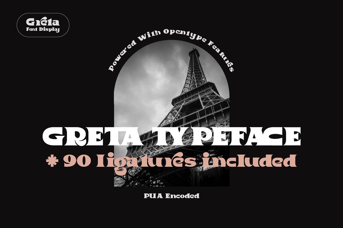 Proudley present “Greta” typeface. Powered with +90 ligatures to bring fluent combination & aesthetic looks. Perfect and suitable for branding, headline, logotype, sticker, editorial design, and etc.