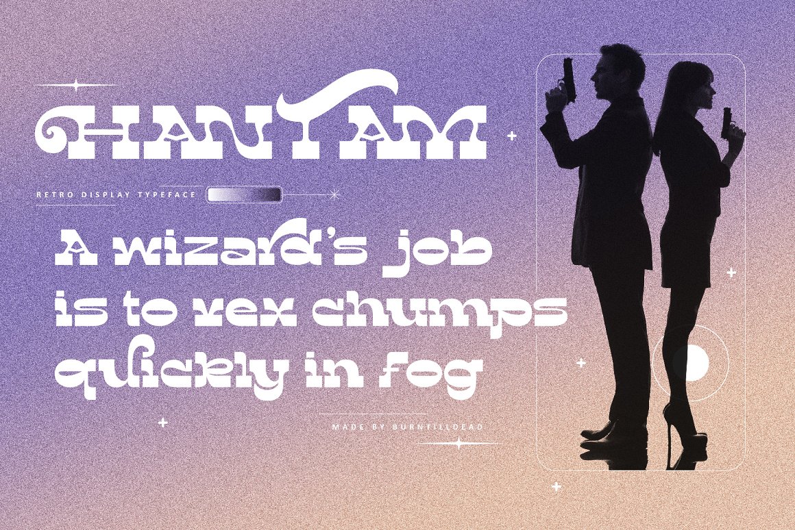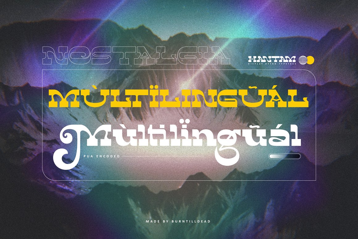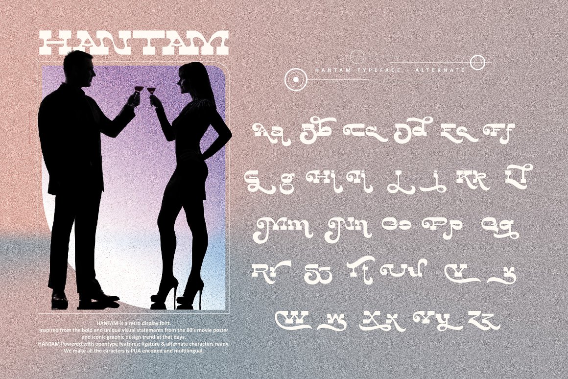 Hantam is a retro display font. Inspired from the bold and unique visual statements from the 80’s movie poster and iconic graphic design trend at that days. Hantam Powered with opentype features; ligature & alternate characters ready. We make all the caracters is PUA encoded and multilingual.