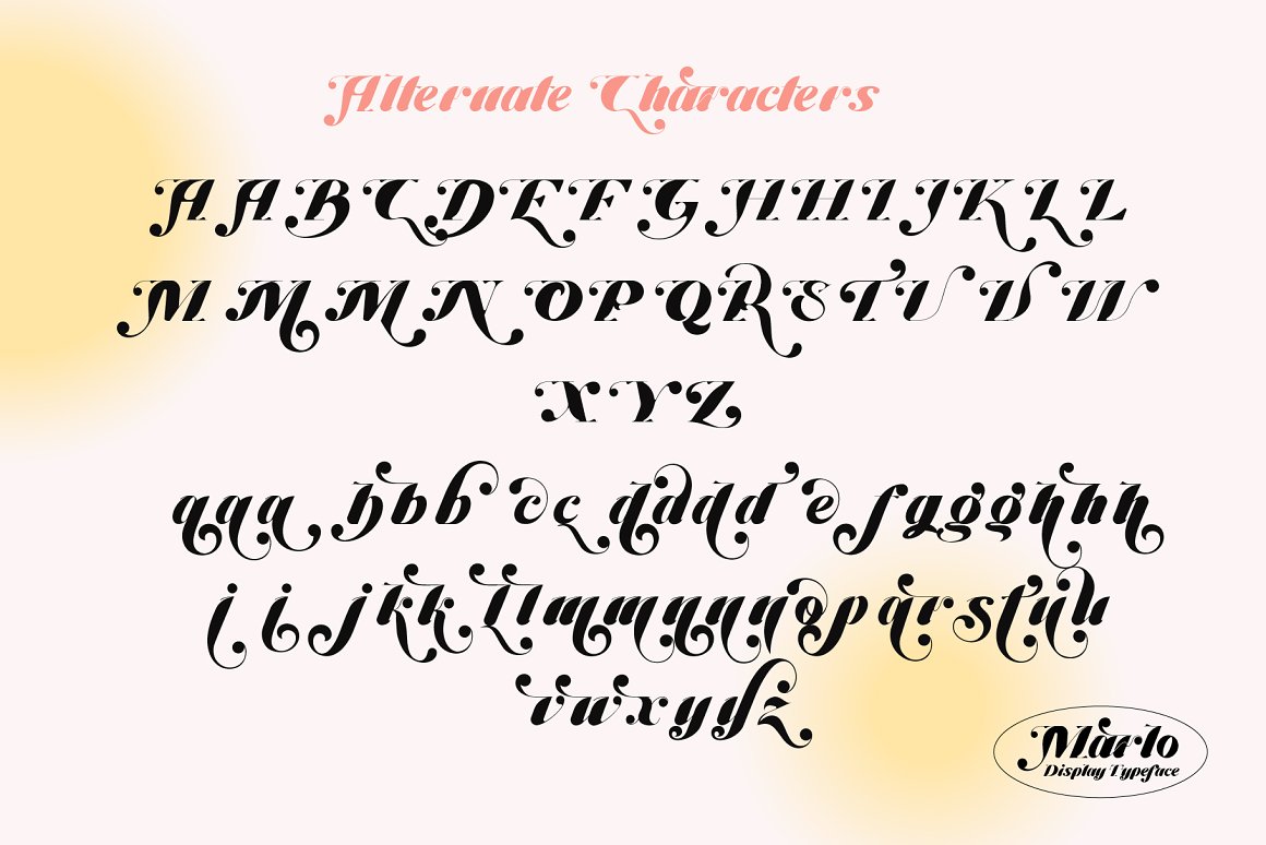 Say hi to “Marlo” a display typeface with extra ornament. Powered with alternate characters, ligature & extra bonus ornament to bring aesthetic looks. Perfect and suitable for branding, headline, logotype, sticker, editorial design, and etc.