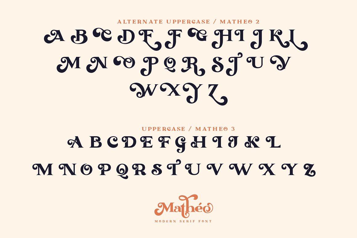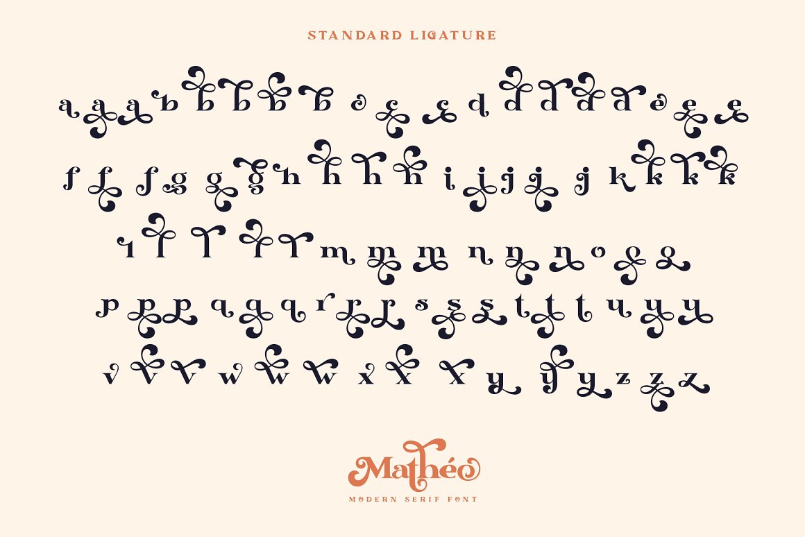 Proudley present “Matheo” a modern serif font. Powered with +140 alternate characters & 26 ligature. Really easy to use & bring standout looks once you play with the combination. We also add “Matheo 2” & “Matheo 3” incase your App or software doesn’t support glyph panel. Perfect and suitable for branding, headline, logotype, sticker, editorial design, and etc.